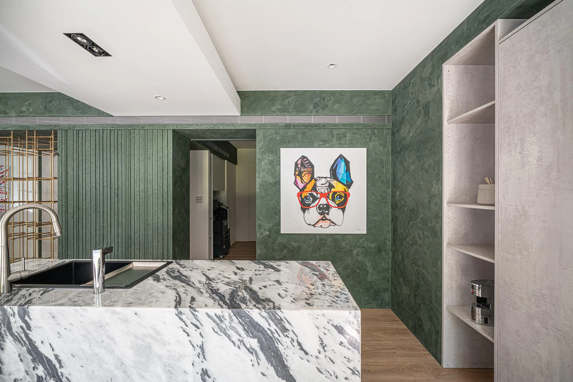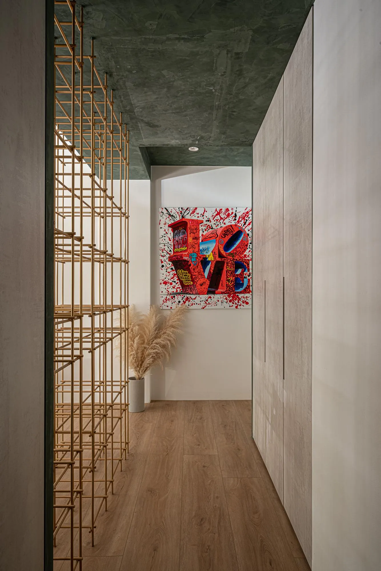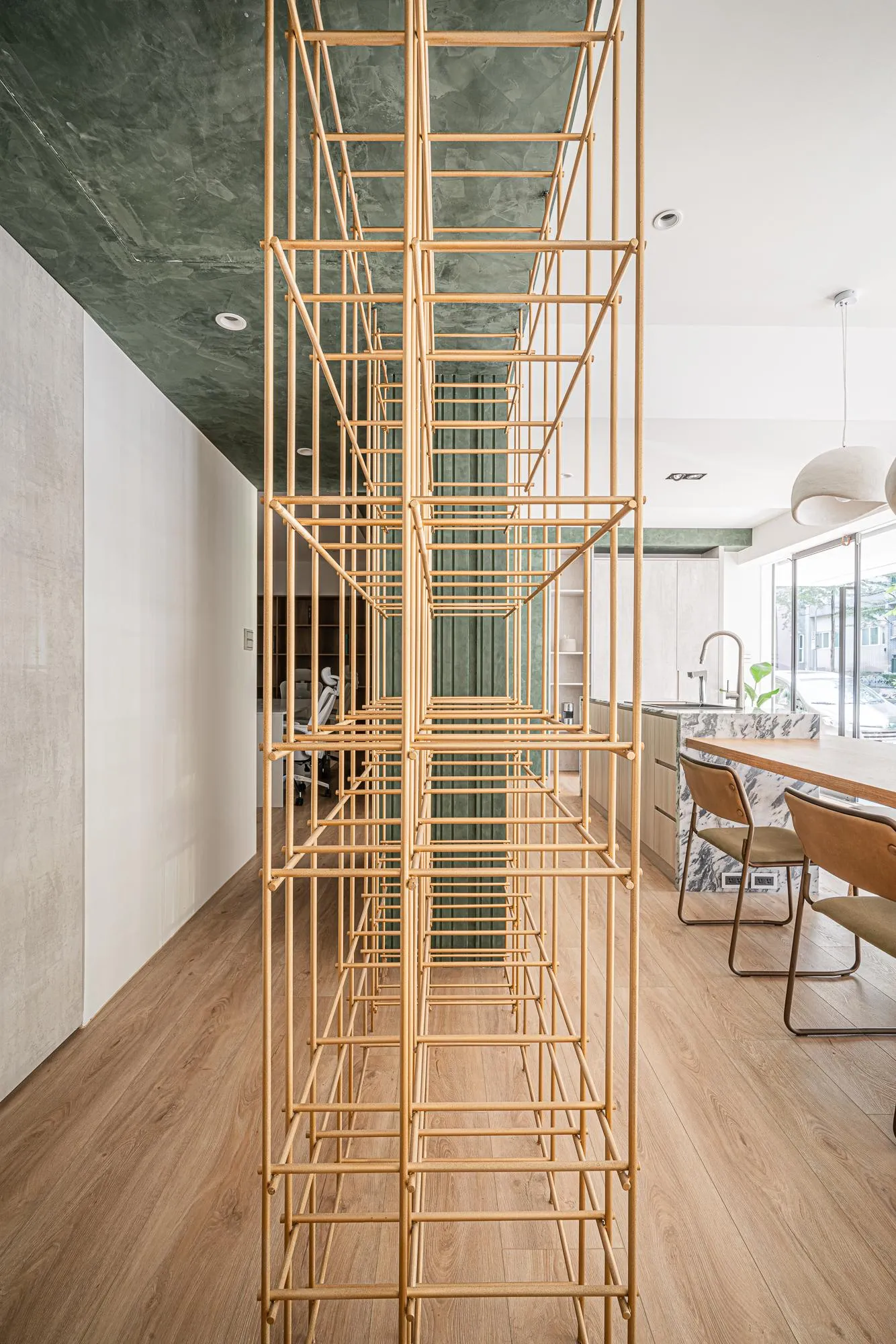 藉由大面落地窗引入戶外綠意,在場域之間以金屬材質設計了一面鏤空造型書架,滿足收納功能之外,同時兼具隔間和裝飾點綴的作用。金屬的反射與光線的穿透性營造出視覺上的流動感,大幅減低長條型格局的擁擠和壓迫。