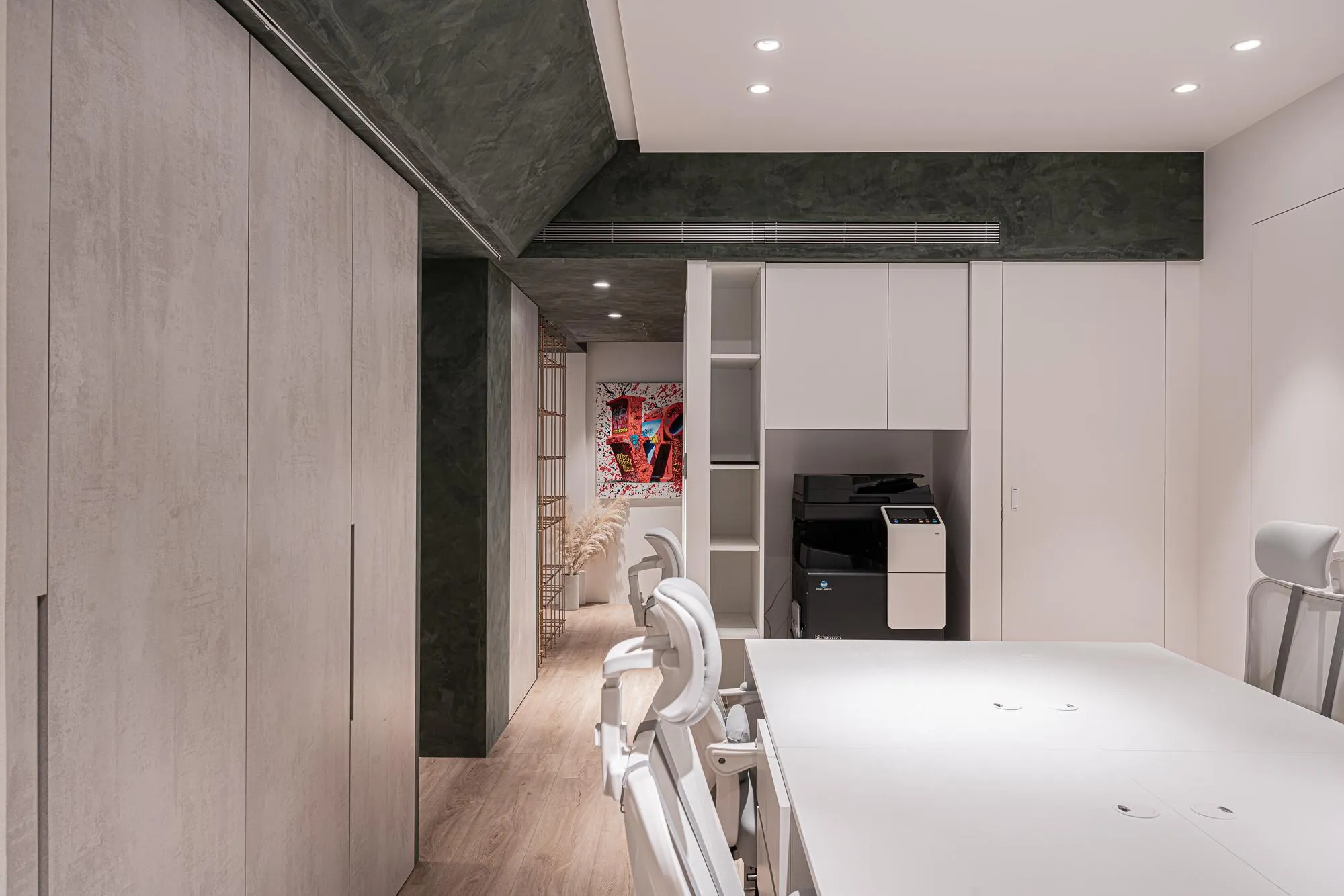 考量到小空間的多樣化需求,我們運用長形吧檯的設計整合會議空間與接待空間,鏡面桌腳的反射延展了空間視覺,讓狹長的室內更顯輕盈。