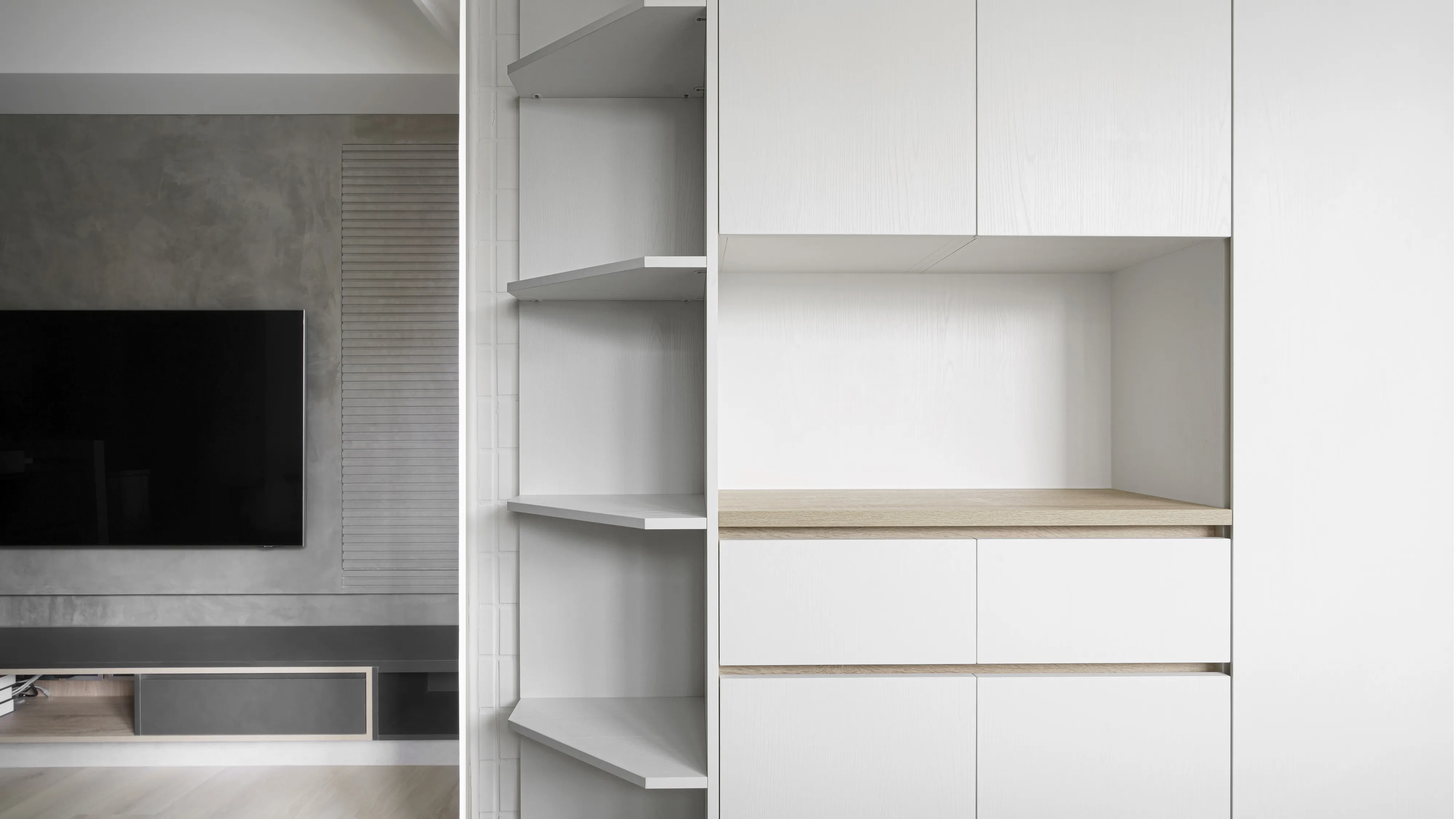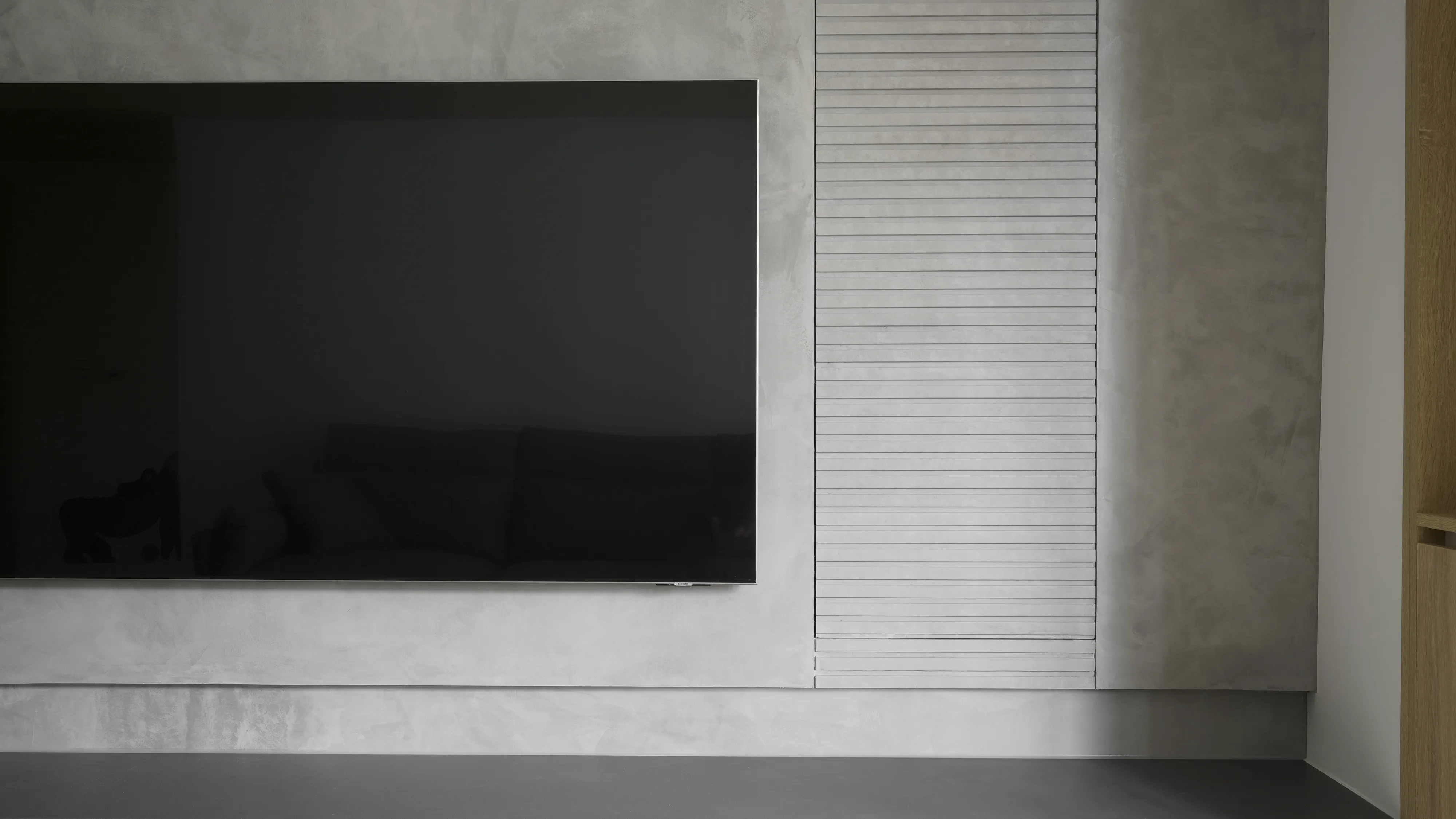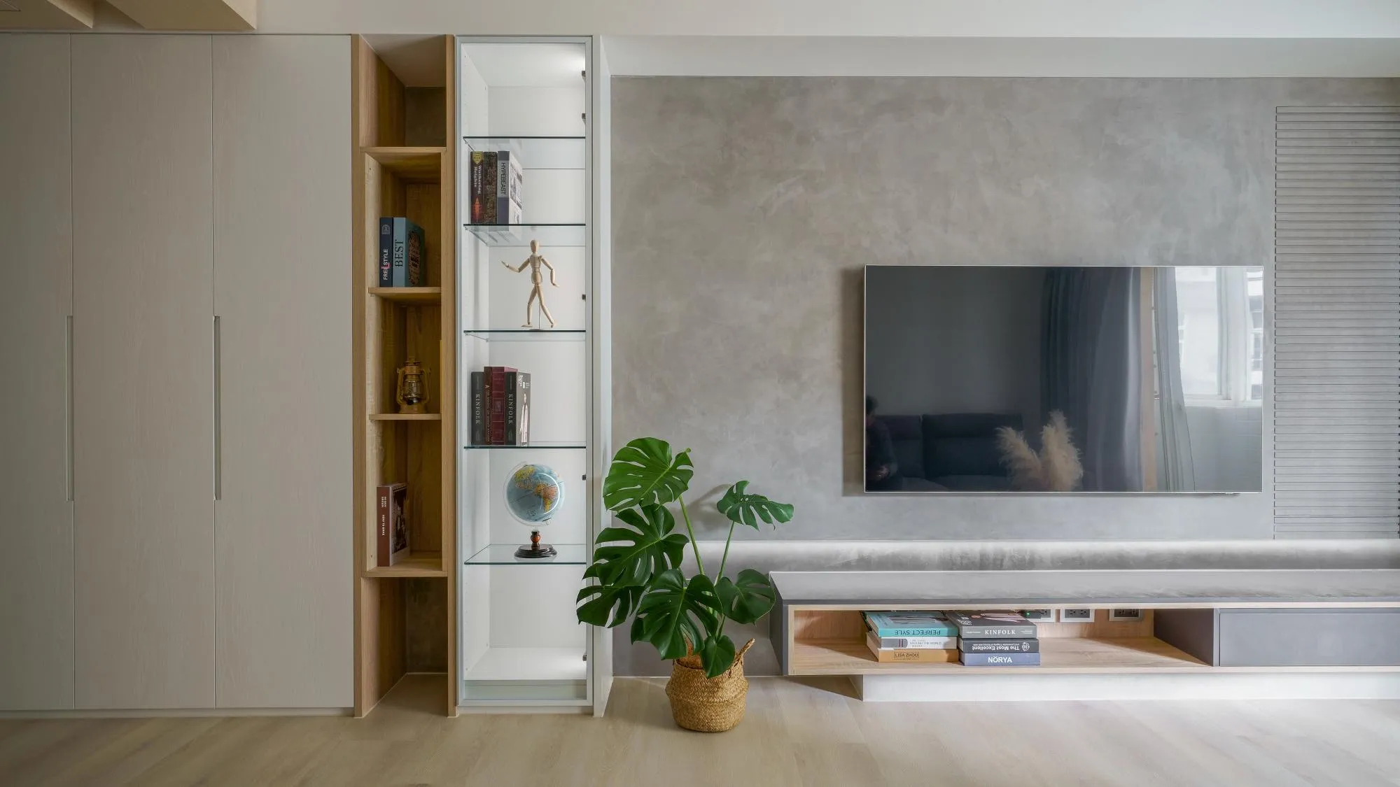 在客廳電視主牆跳色讓視覺上有放大效果 , 順應空間原有條件