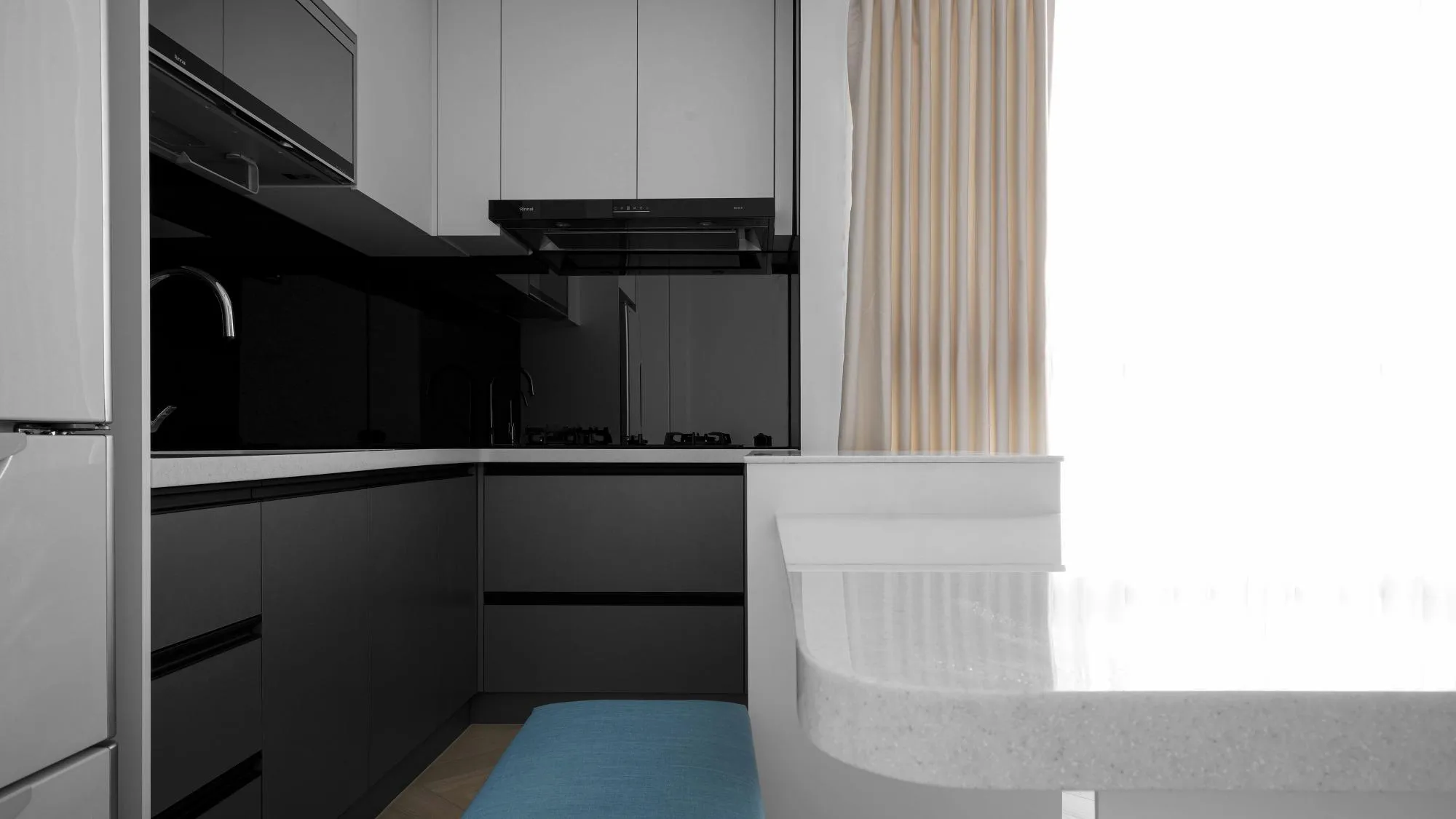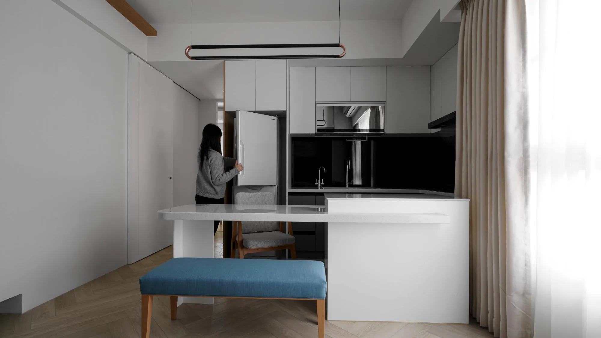 來增加面盆及淋浴間空間 , 也將客廳及廚房做開放設計
