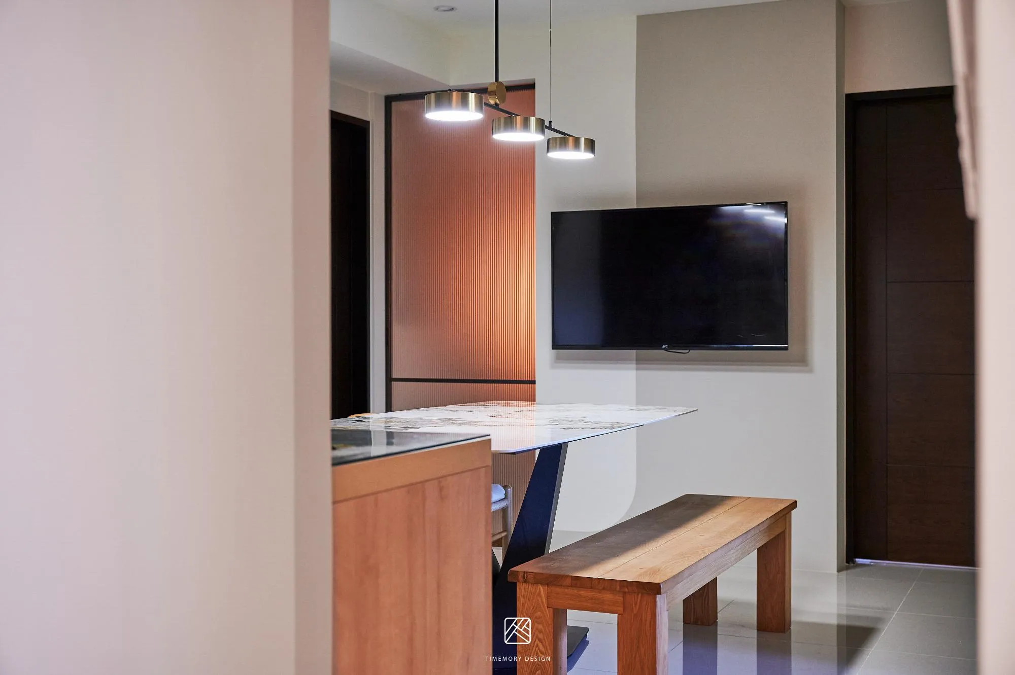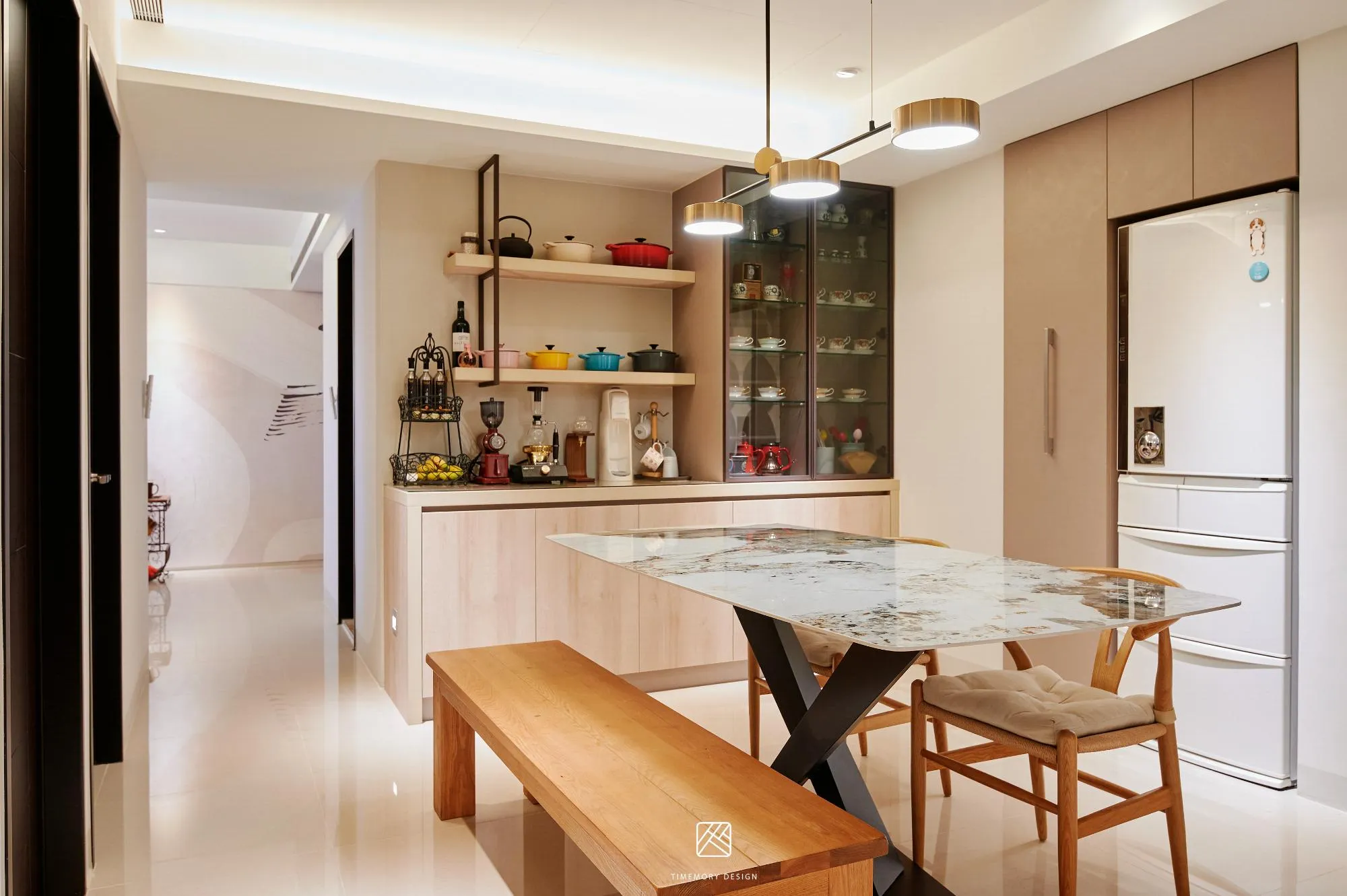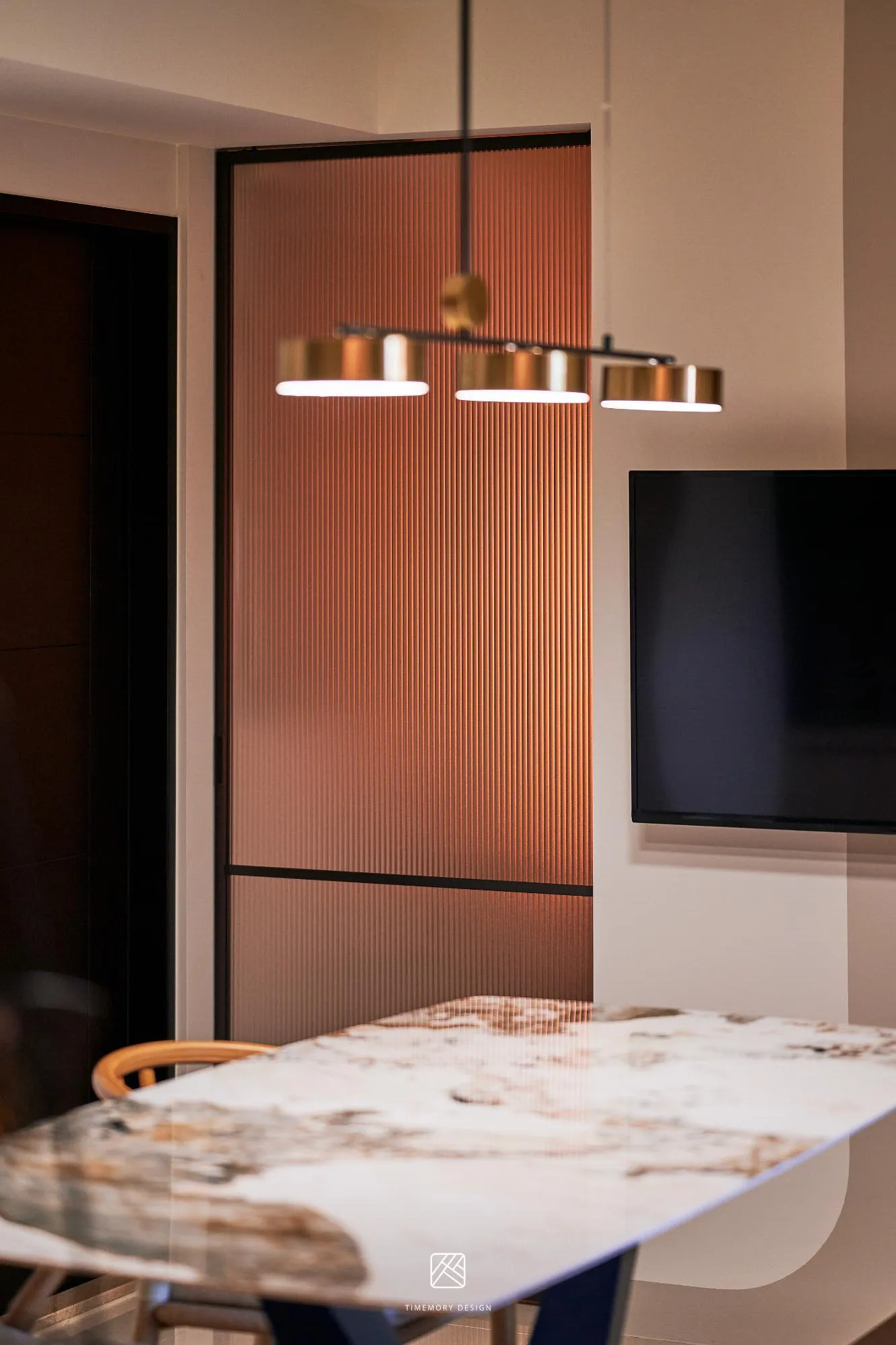 使用水墨壁紙和塗料創造出深沉的氛圍,並使用黃金比例弧形創造出耀眼的效果,