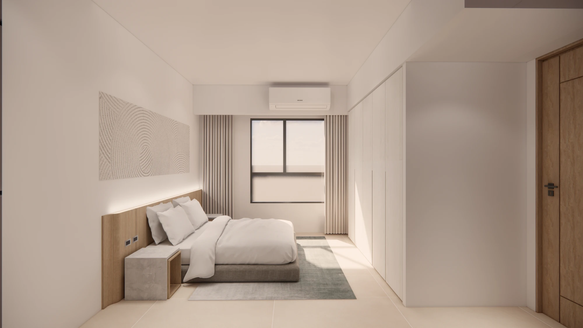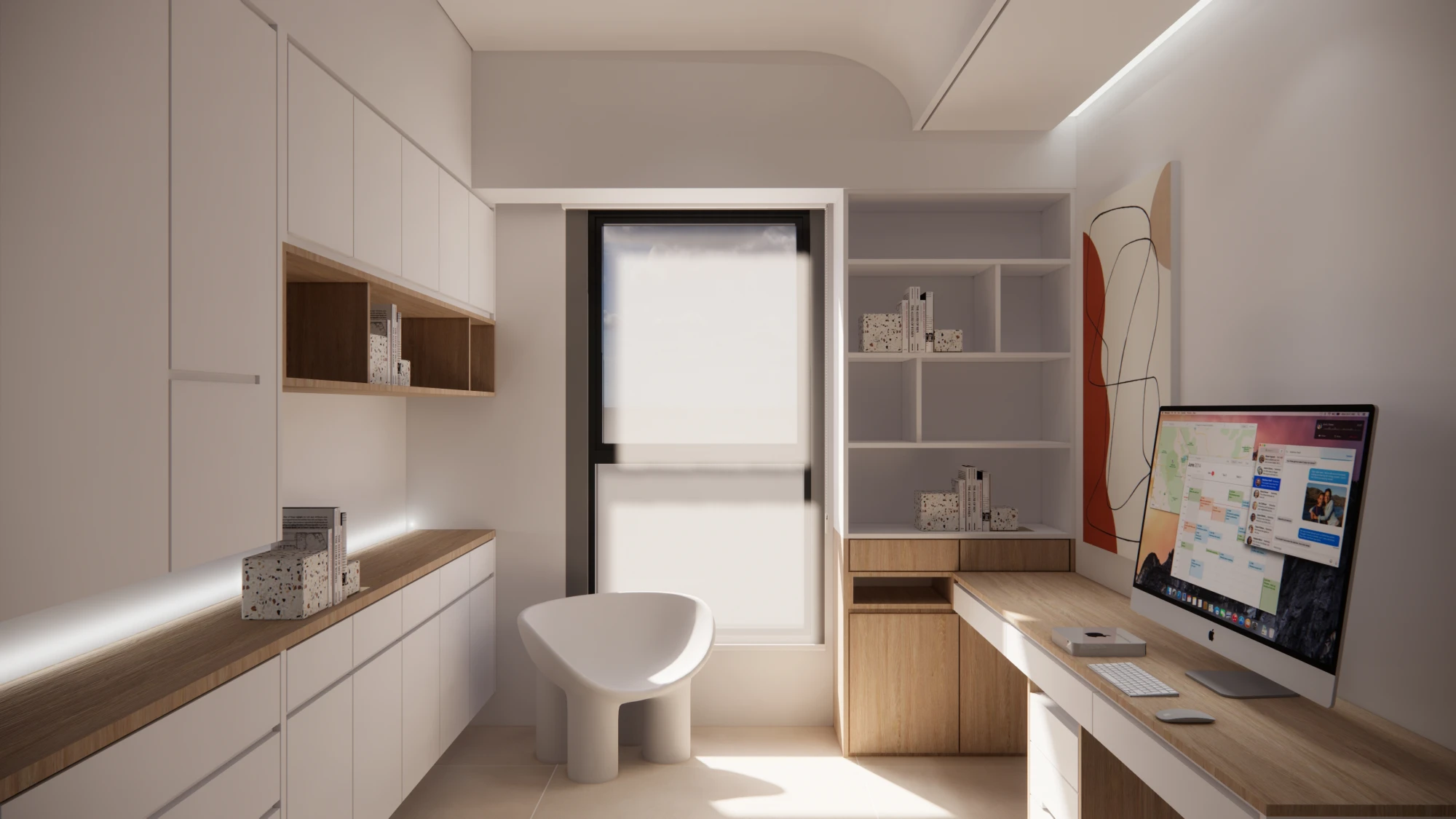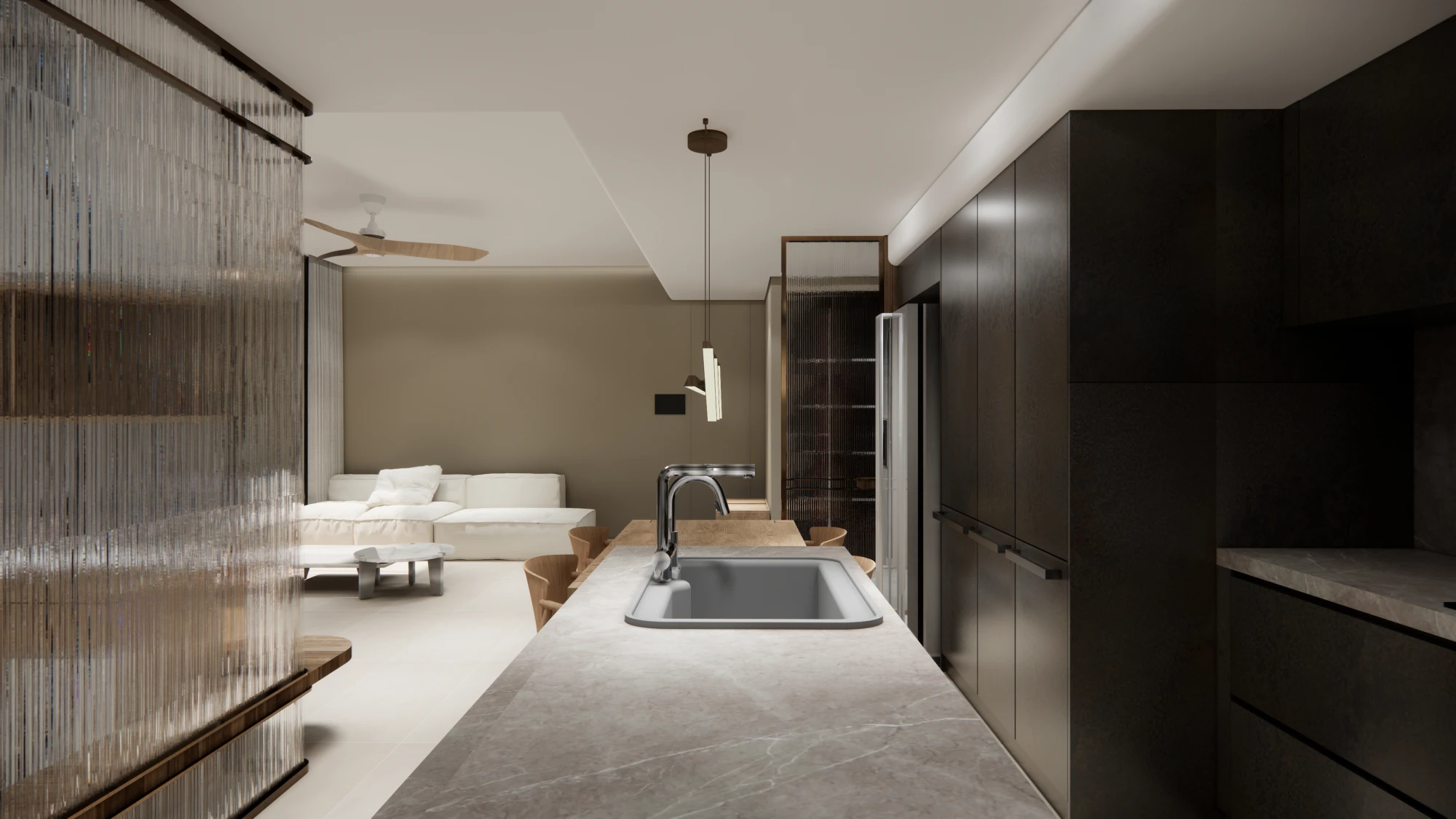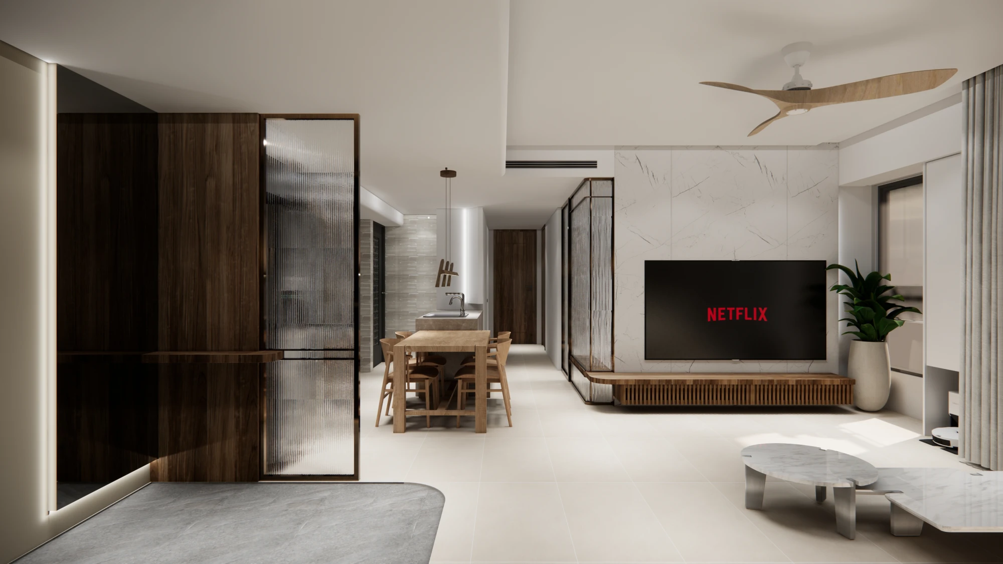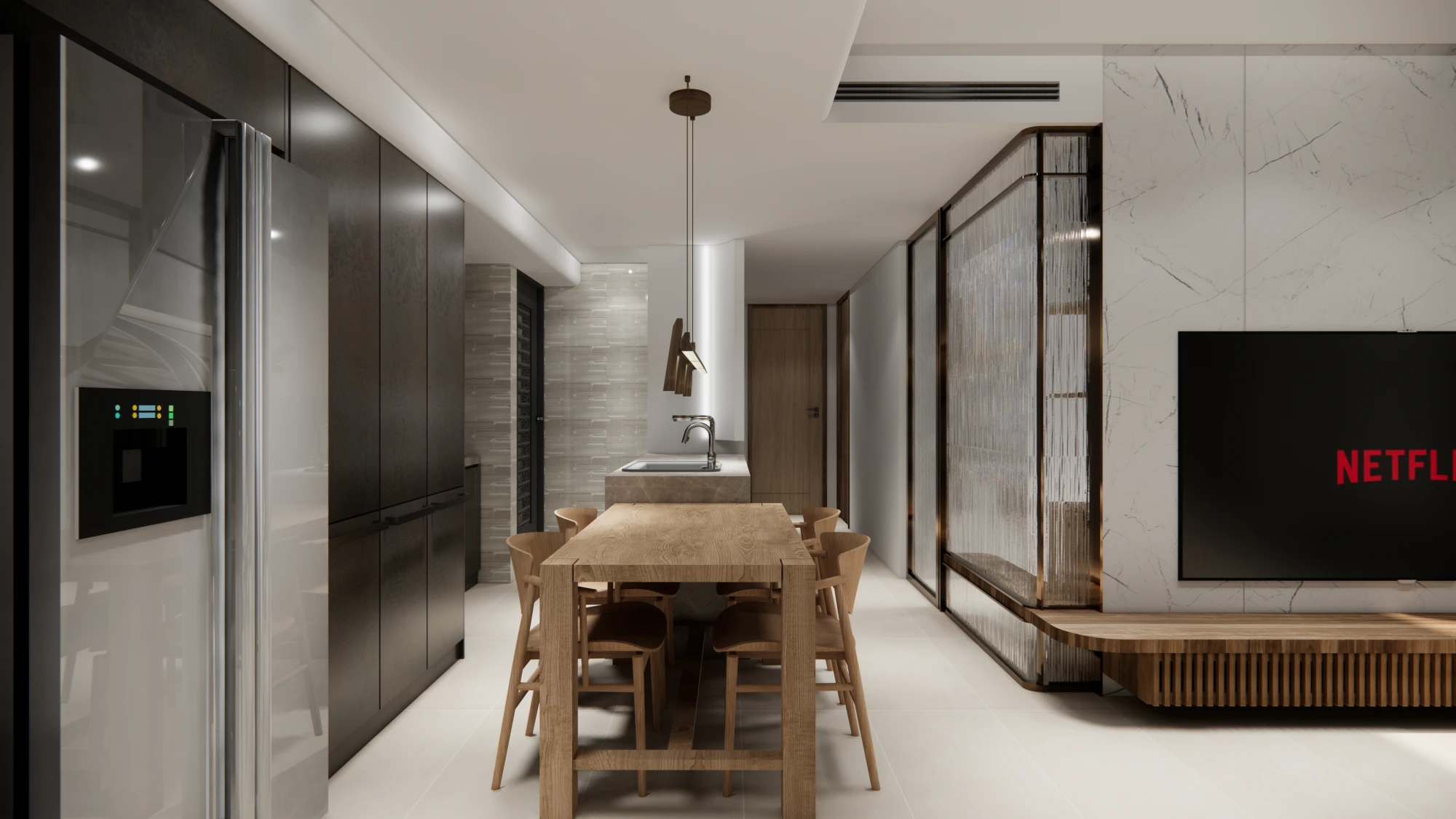 This interior design takes you on a journey into a stunning world of creativity and elegance. Carefully planned in a long and narrow space, it encompasses a dining area, foyer, study, children's room, and master bedroom. Each area boasts its unique functions and features, yet the overall design philosophy remains consistent.