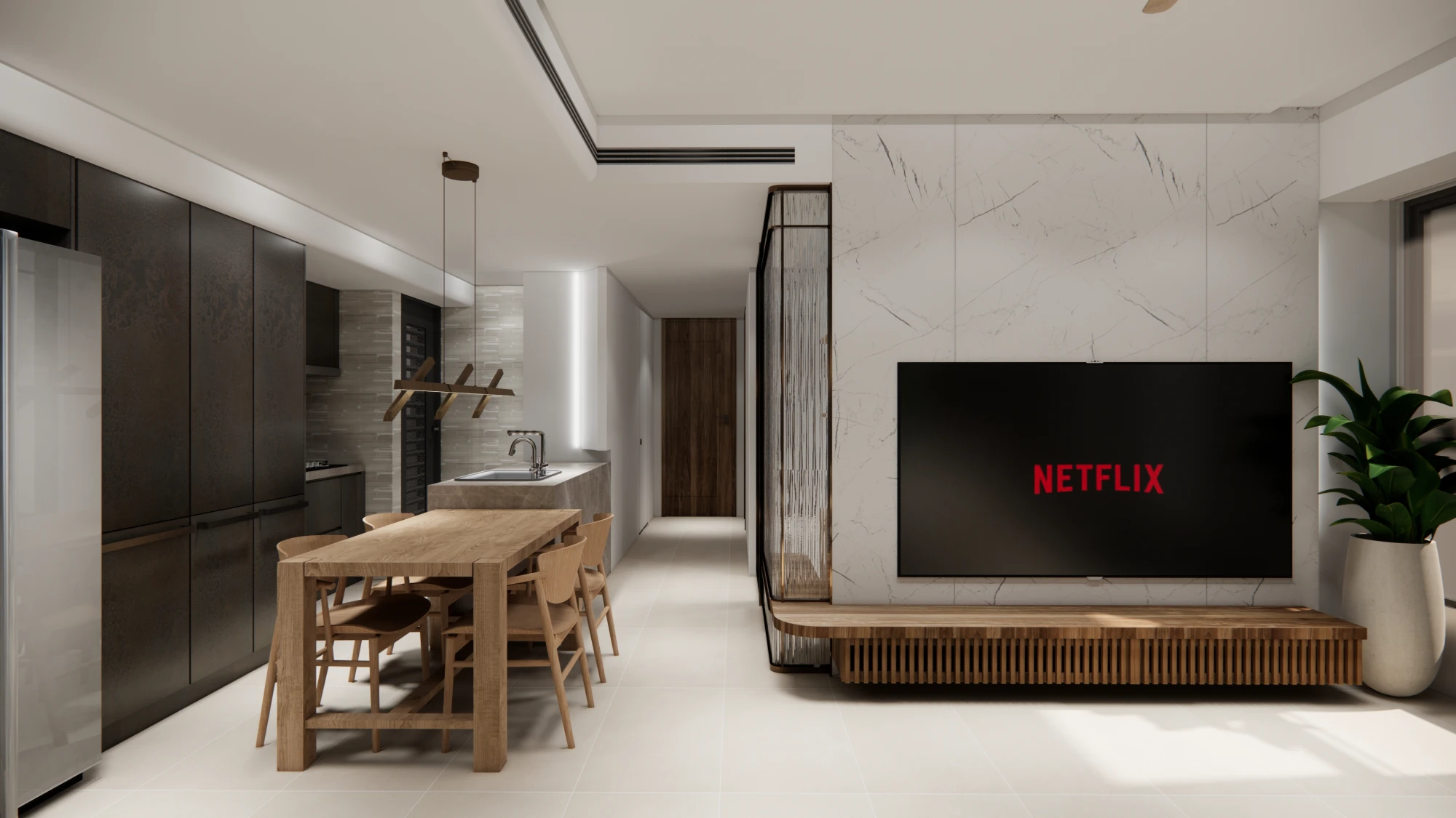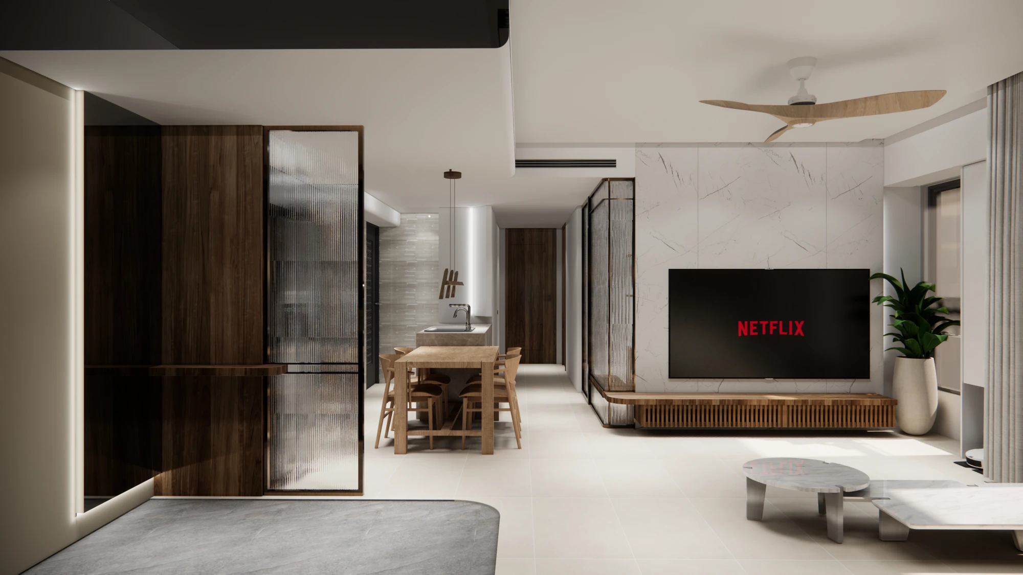 這個室內設計將您帶入一個令人驚艷的室內世界,充滿創意和優雅的細節。這個長型空間被細心規劃,包含客餐廳、玄關、書房、小孩房和主臥室,每個區域都有其獨特的功能和特色,但整個空間的設計理念始終保持一致。
