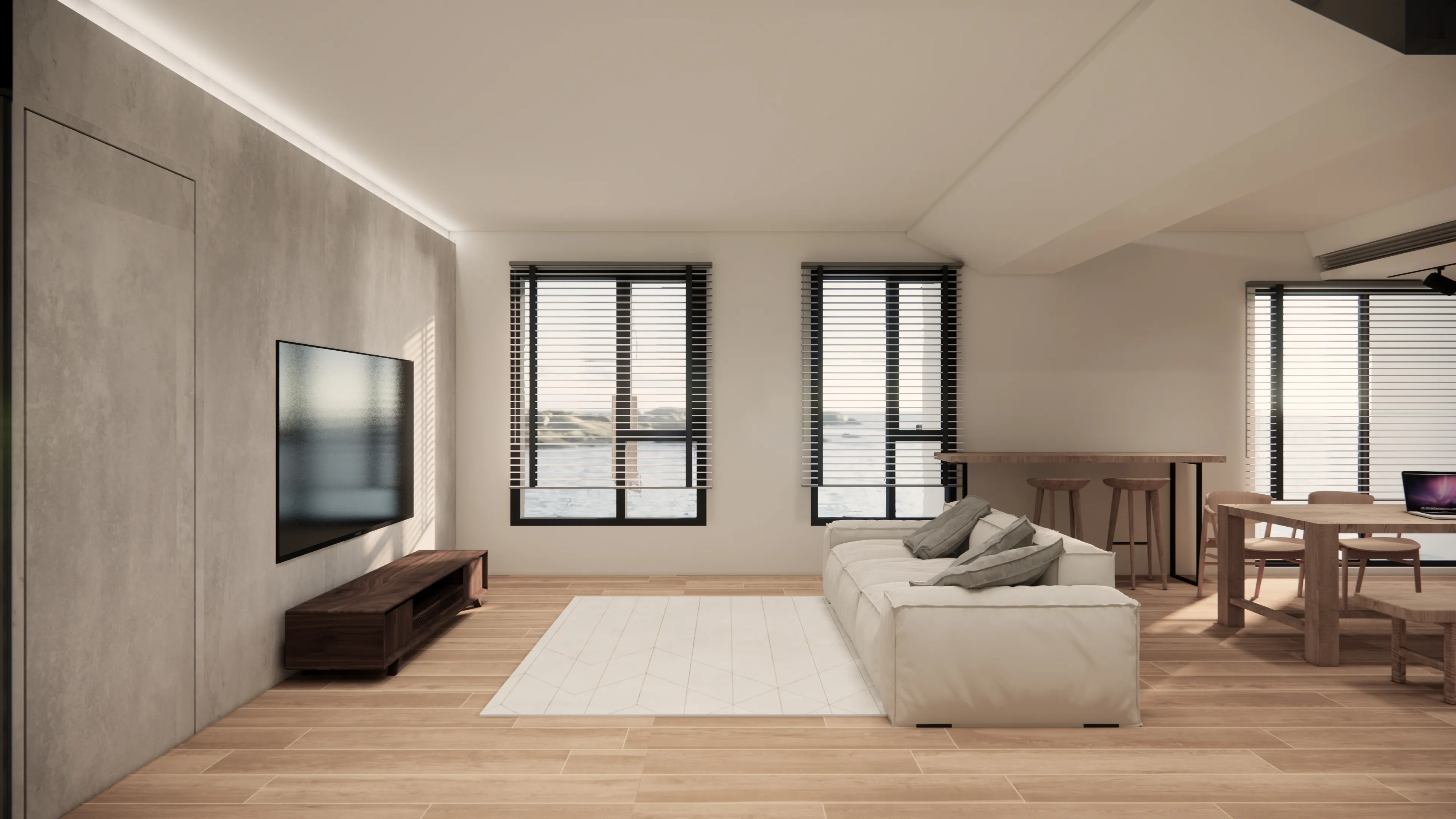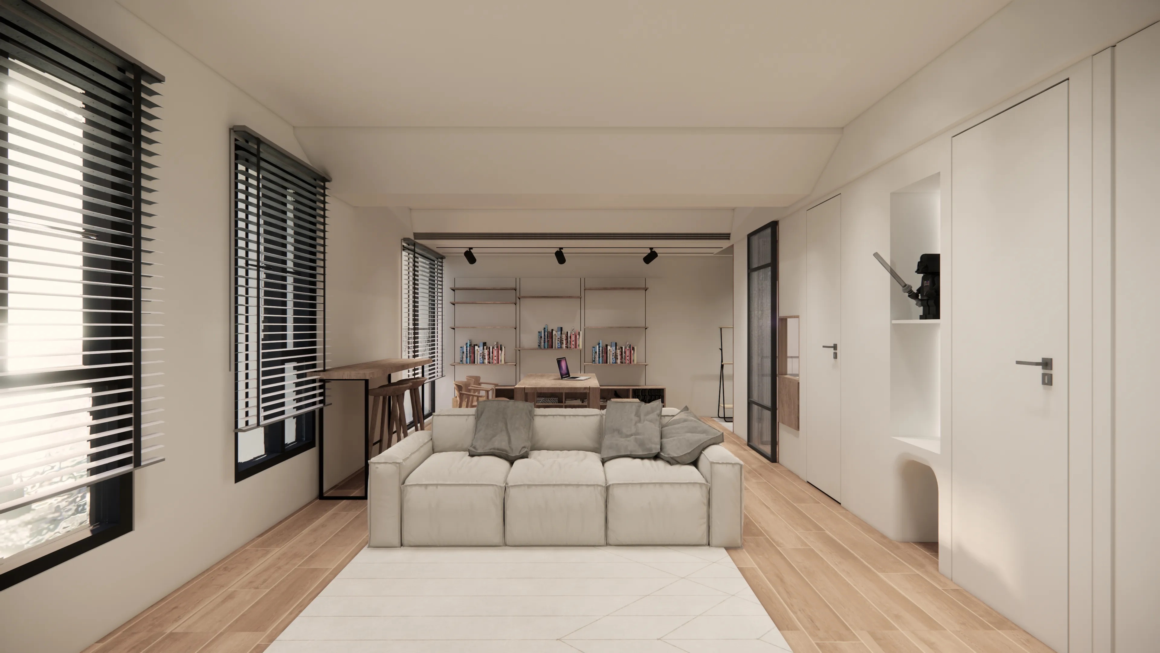 Finally, lighting plays a crucial role in this design, akin to a LEGO lighthouse guiding people into this delightful interior world. Japanese-style homes emphasize natural light and soft illumination. The homeowner chose sleek and modern light fixtures, allowing for adjustable brightness and direction, creating various atmospheres within the space.