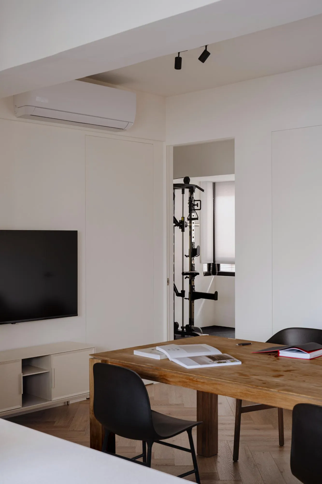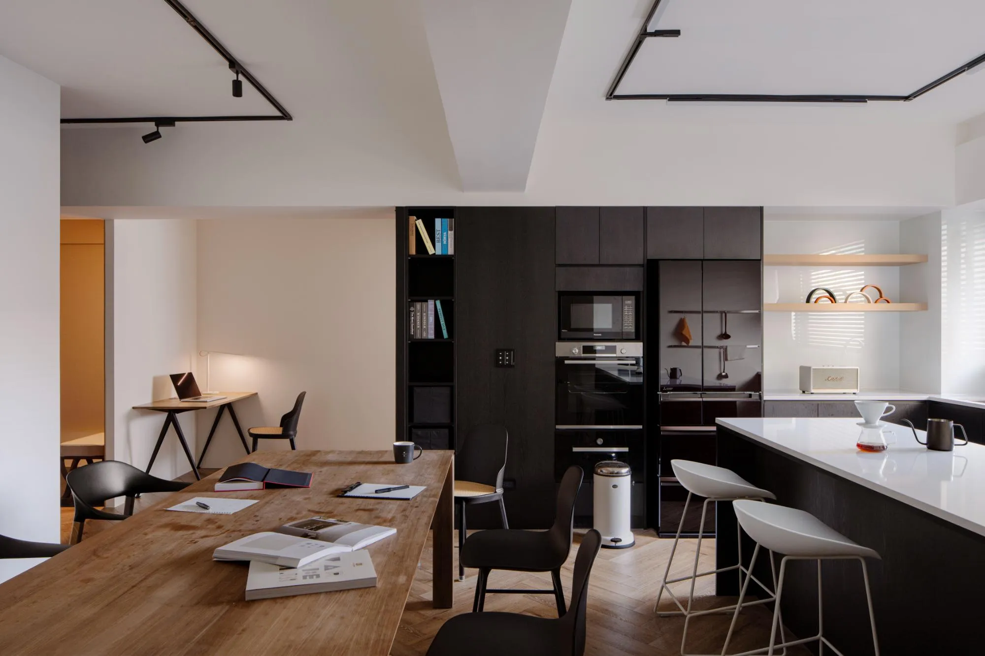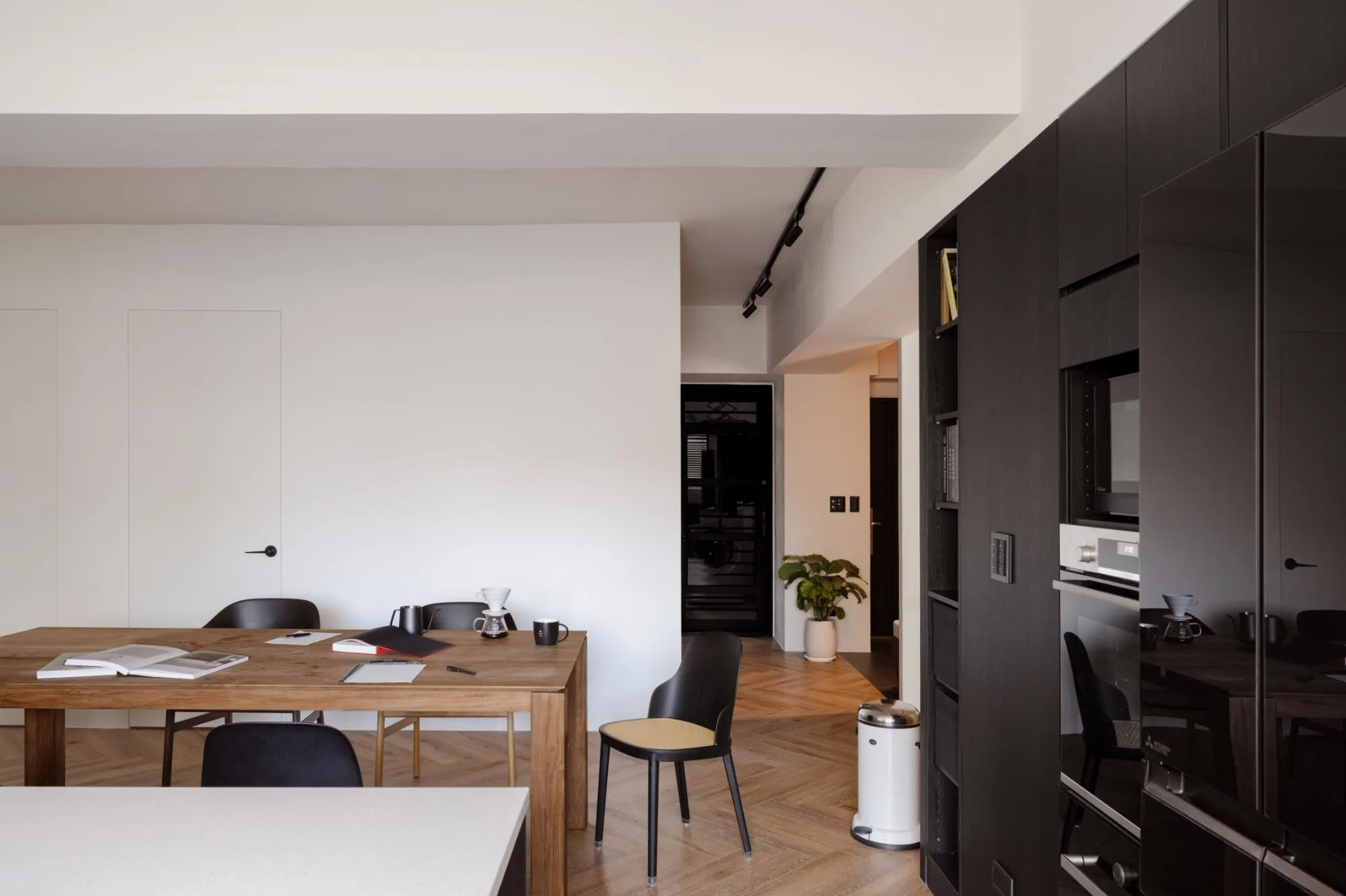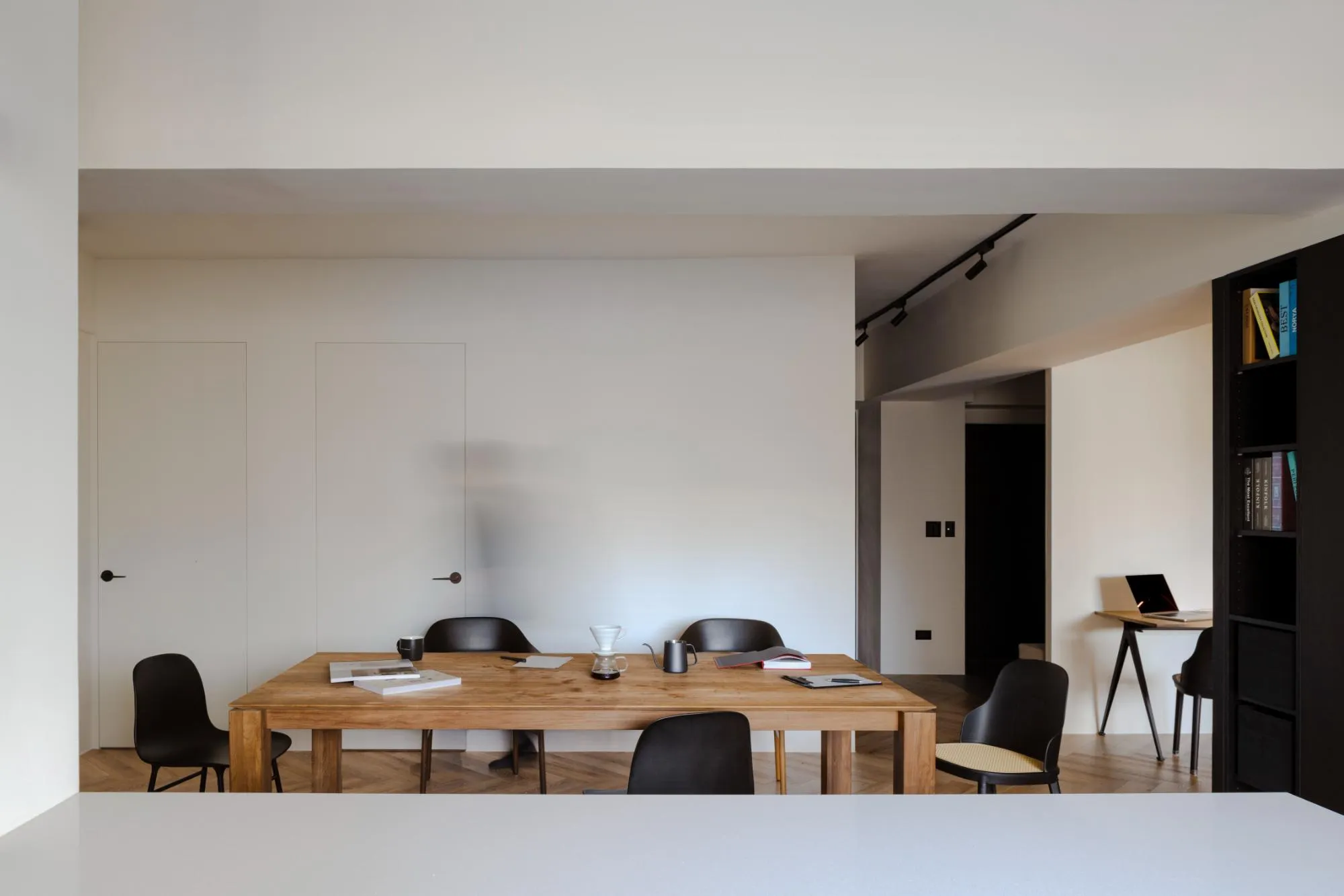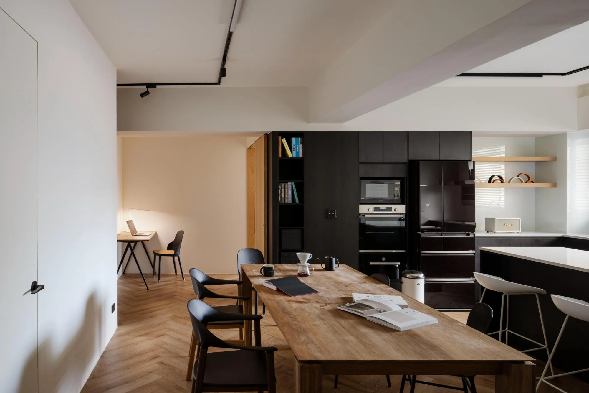 傳統客廳的核心往往是沙發,而本案顛覆這一慣例,捨棄過多裝飾,以長型餐桌為中心,搭配開放式廚房,打造極簡而富有互動性的生活場域。