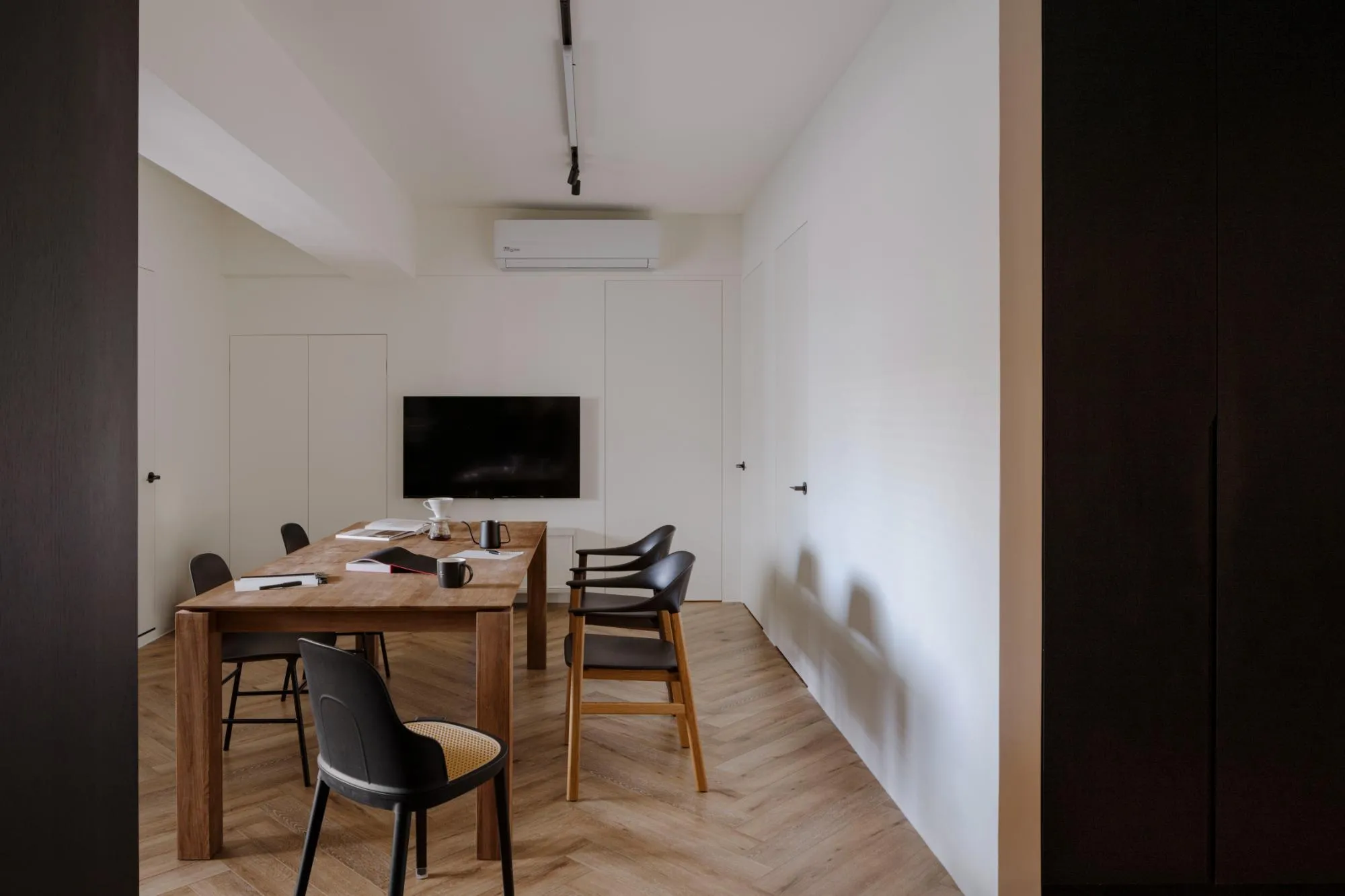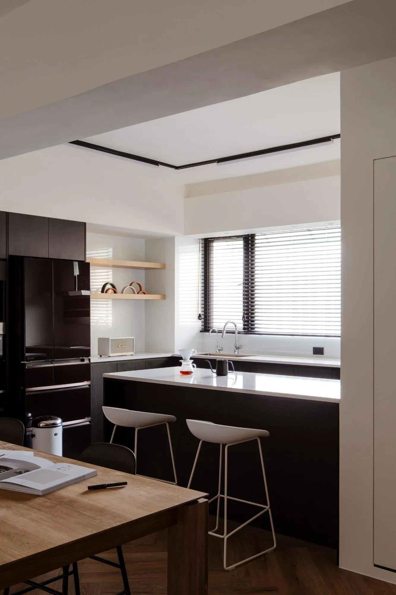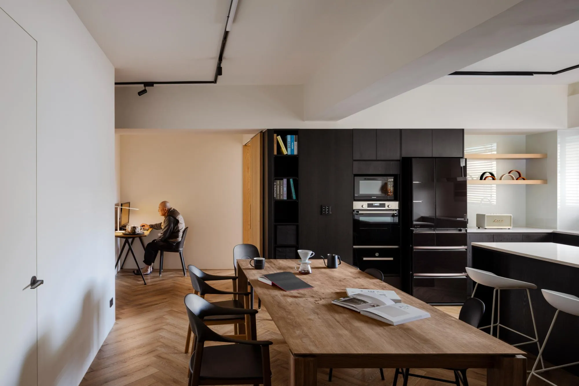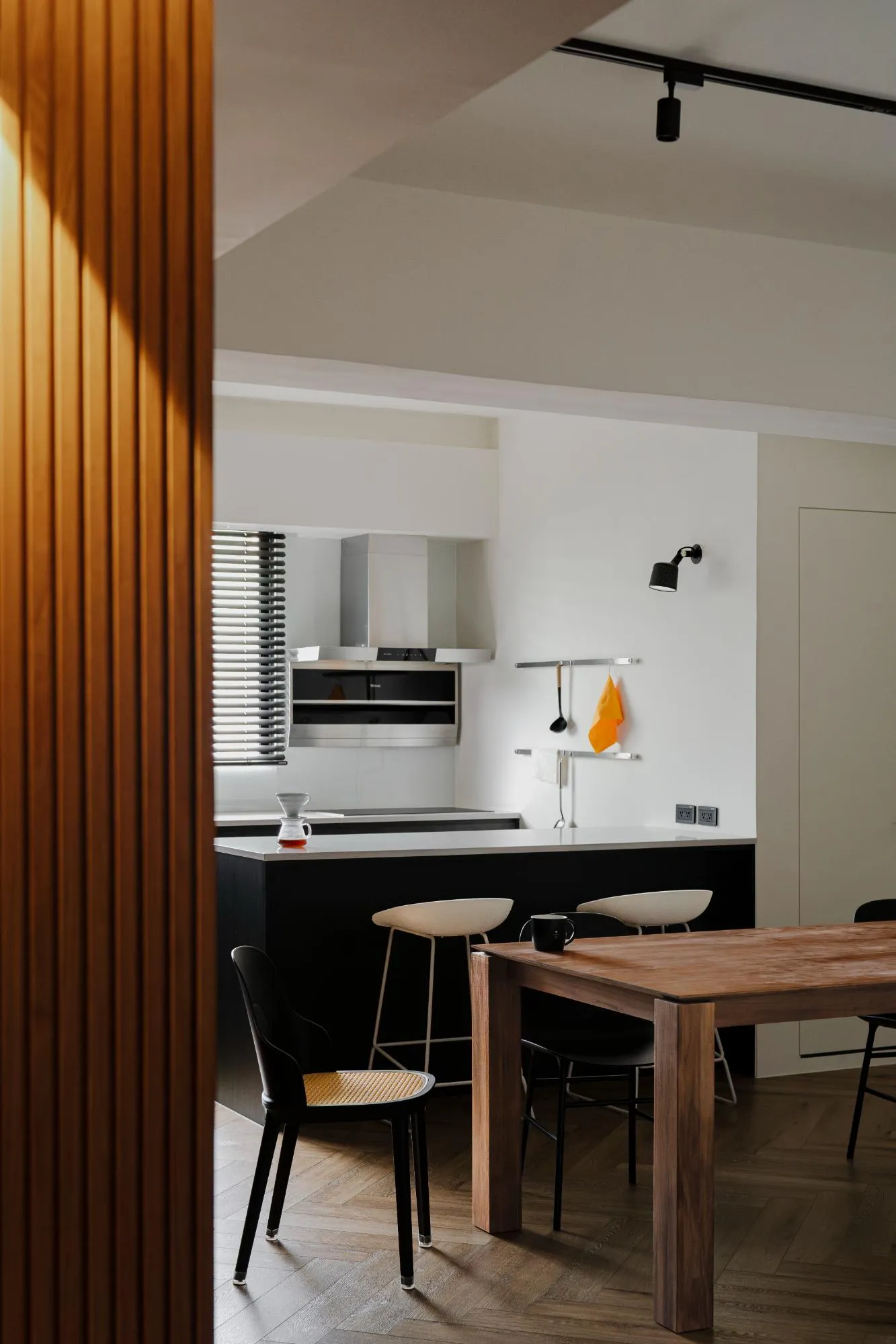 傳統客廳的核心往往是沙發,而本案顛覆這一慣例,捨棄過多裝飾,以長型餐桌為中心,搭配開放式廚房,打造極簡而富有互動性的生活場域。