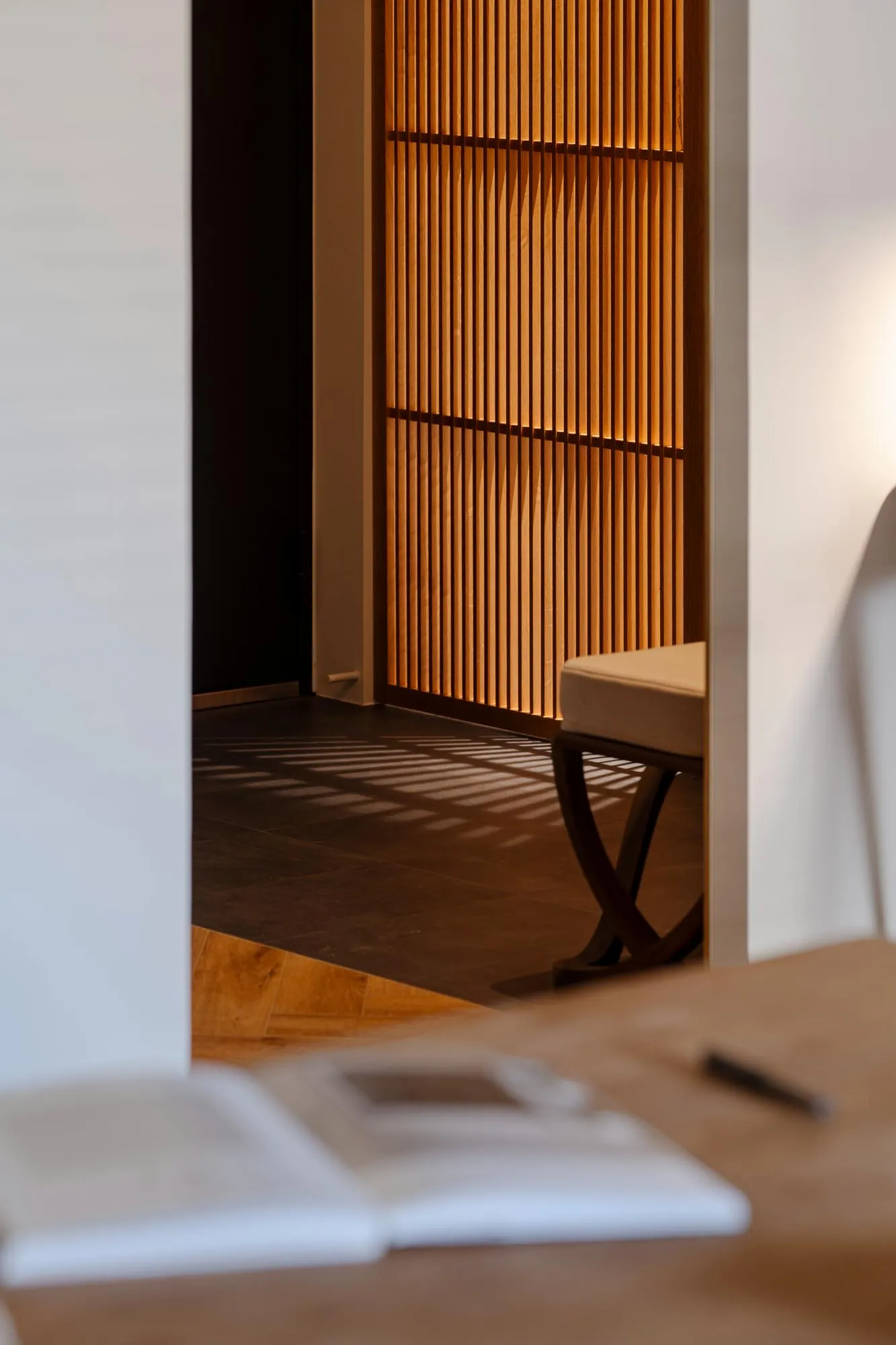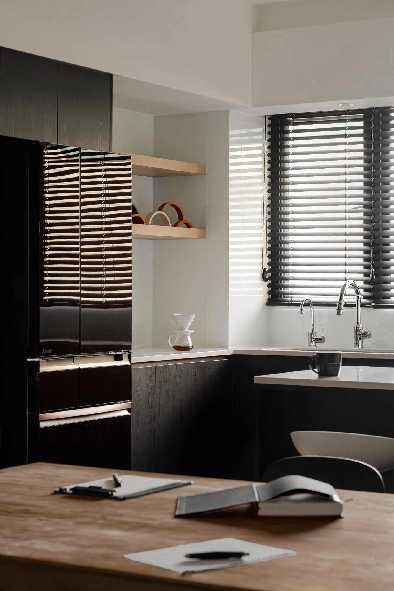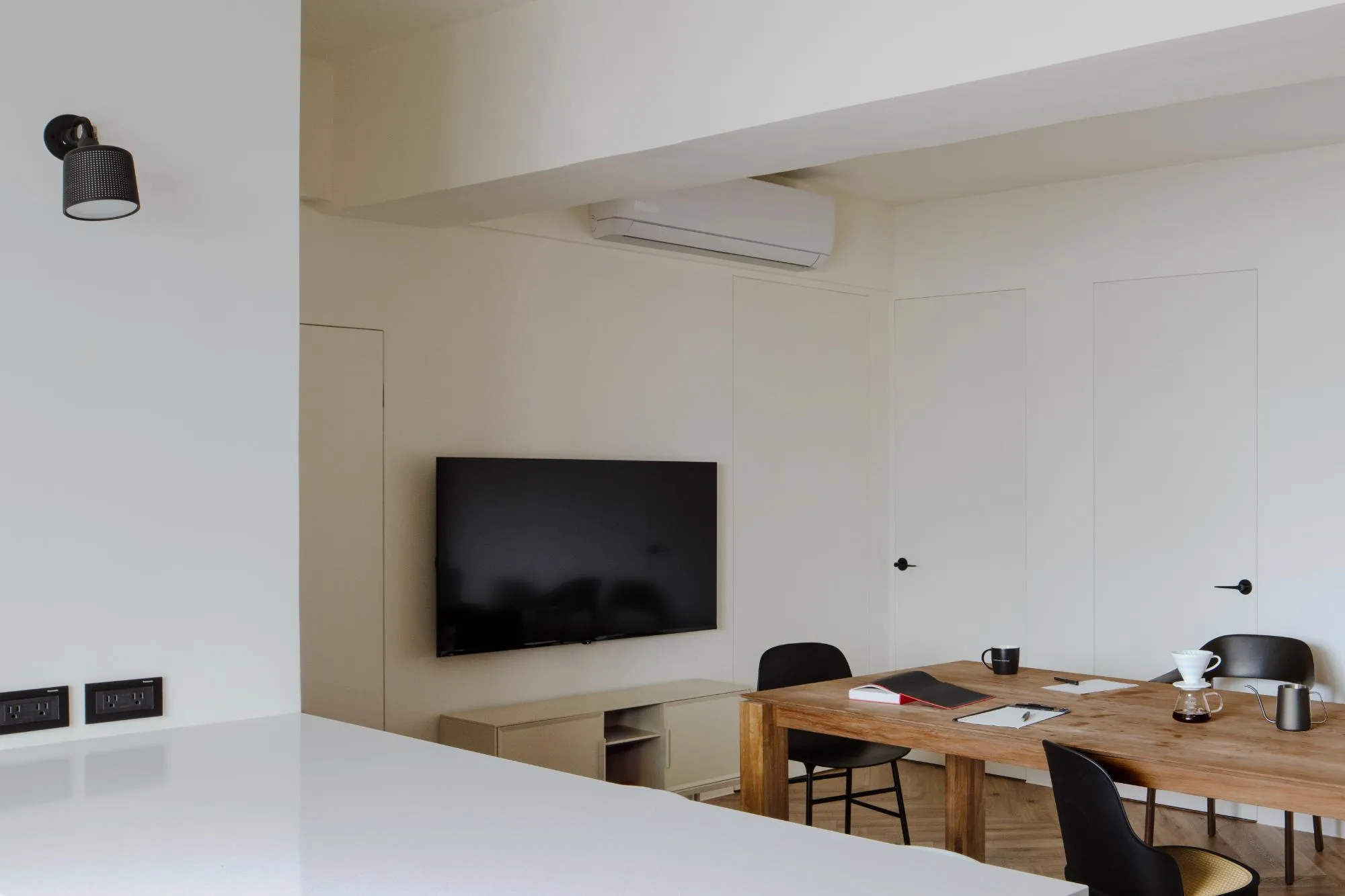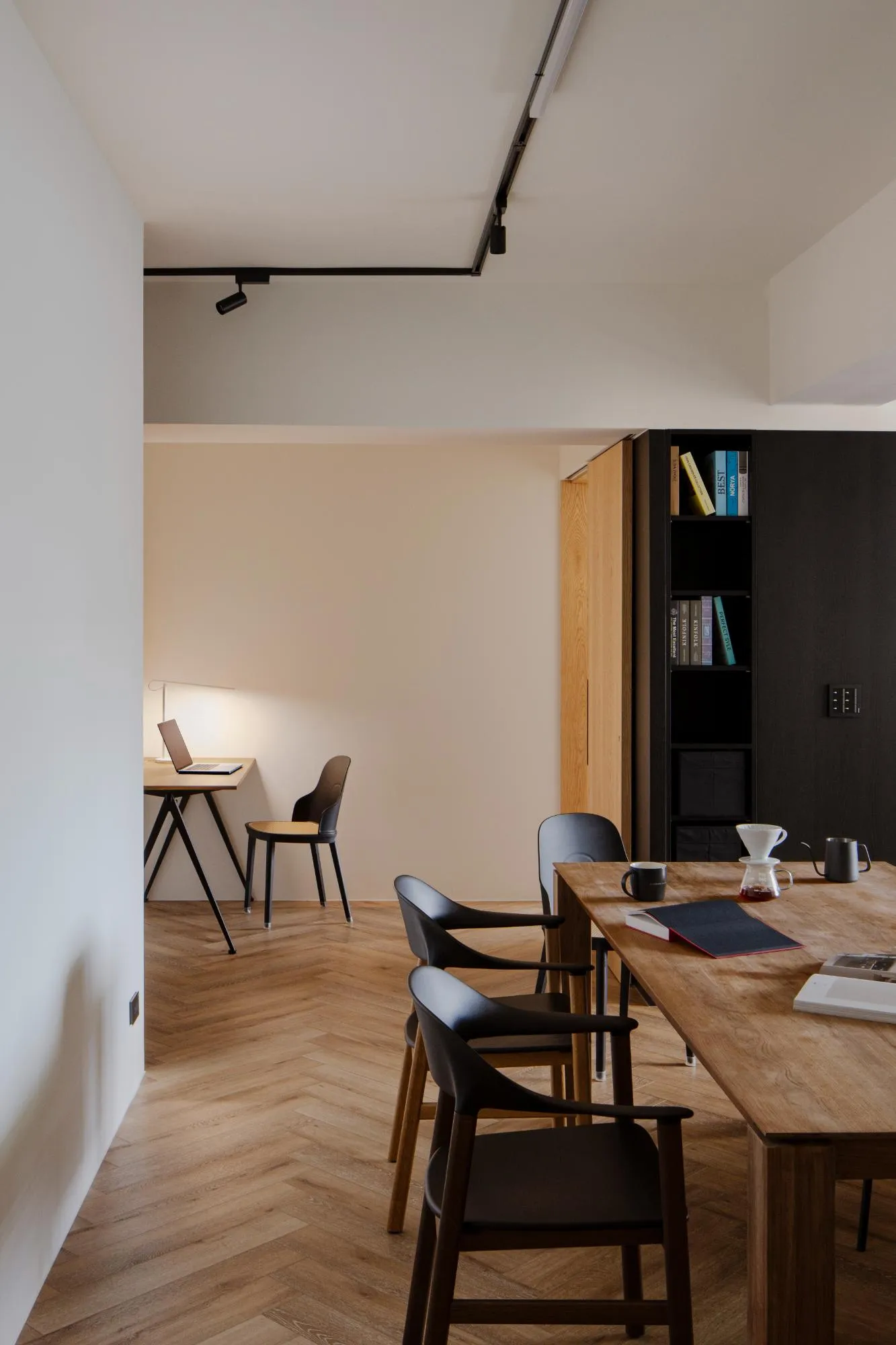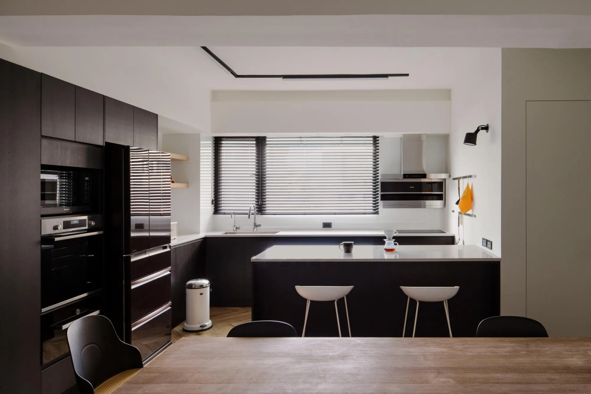傳統客廳的核心往往是沙發,而本案顛覆這一慣例,捨棄過多裝飾,以長型餐桌為中心,搭配開放式廚房,打造極簡而富有互動性的生活場域。