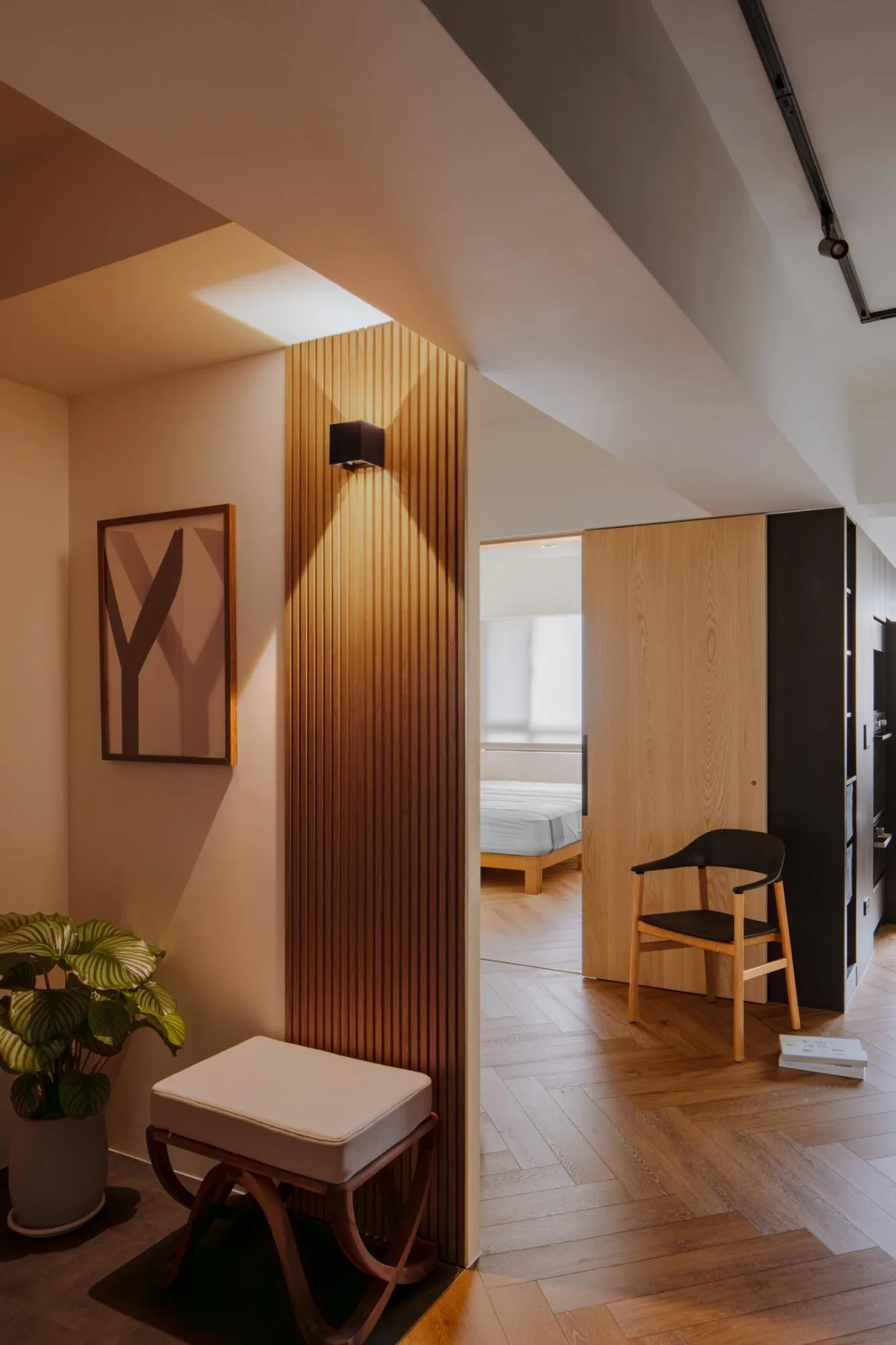 本案不過度裝飾,去除繁複設計,以材質、光線與純粹色彩形塑空間氛圍,回應現代人對於簡約生活、彈性空間與情感互動的需求。最終,讓客廳不只是休憩場所,而是家人共享時光的核心,於純粹空間中