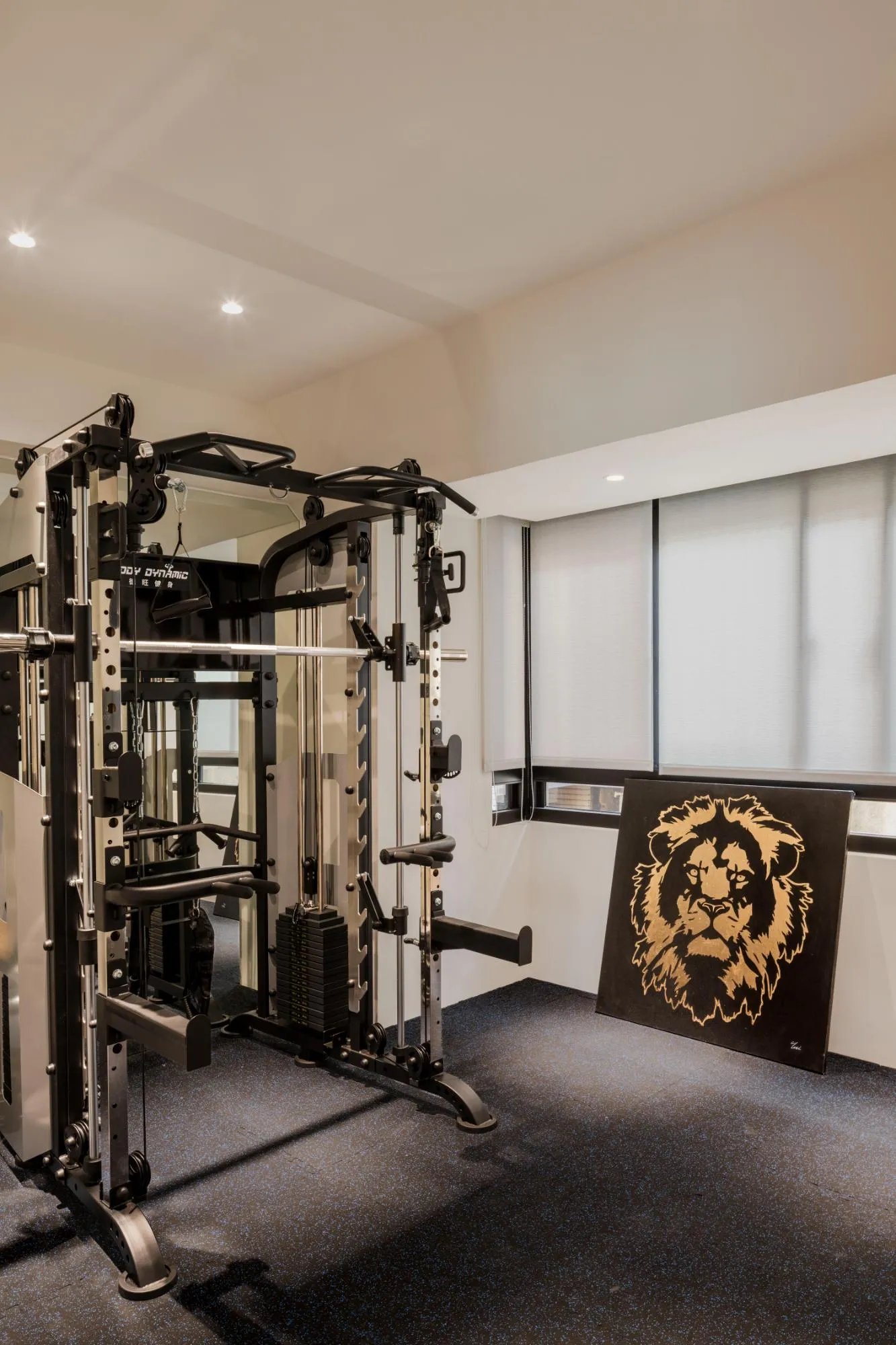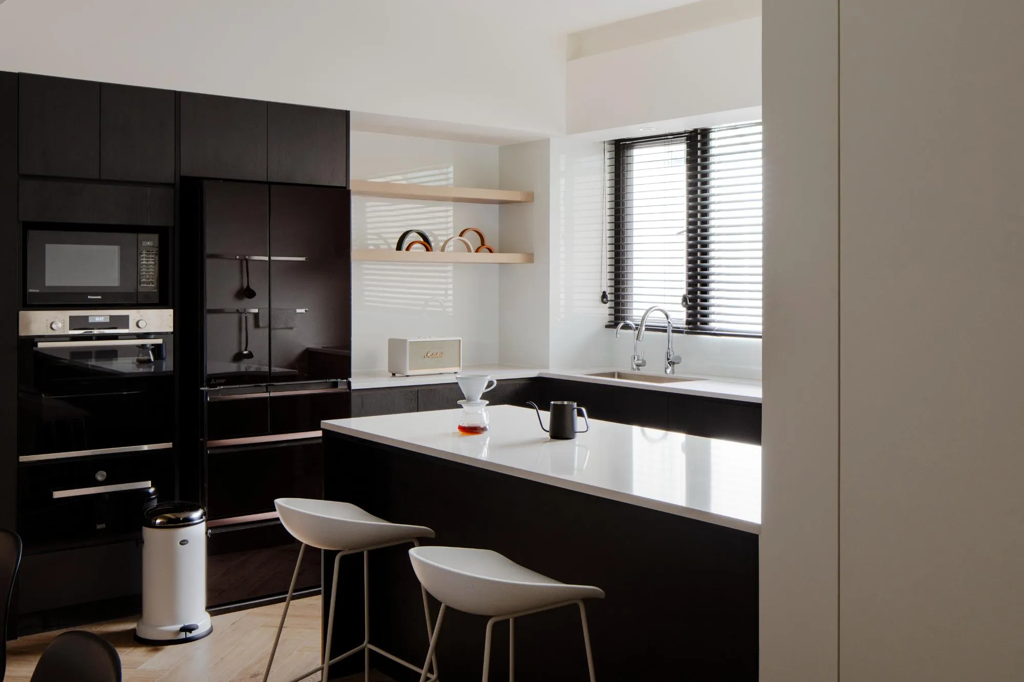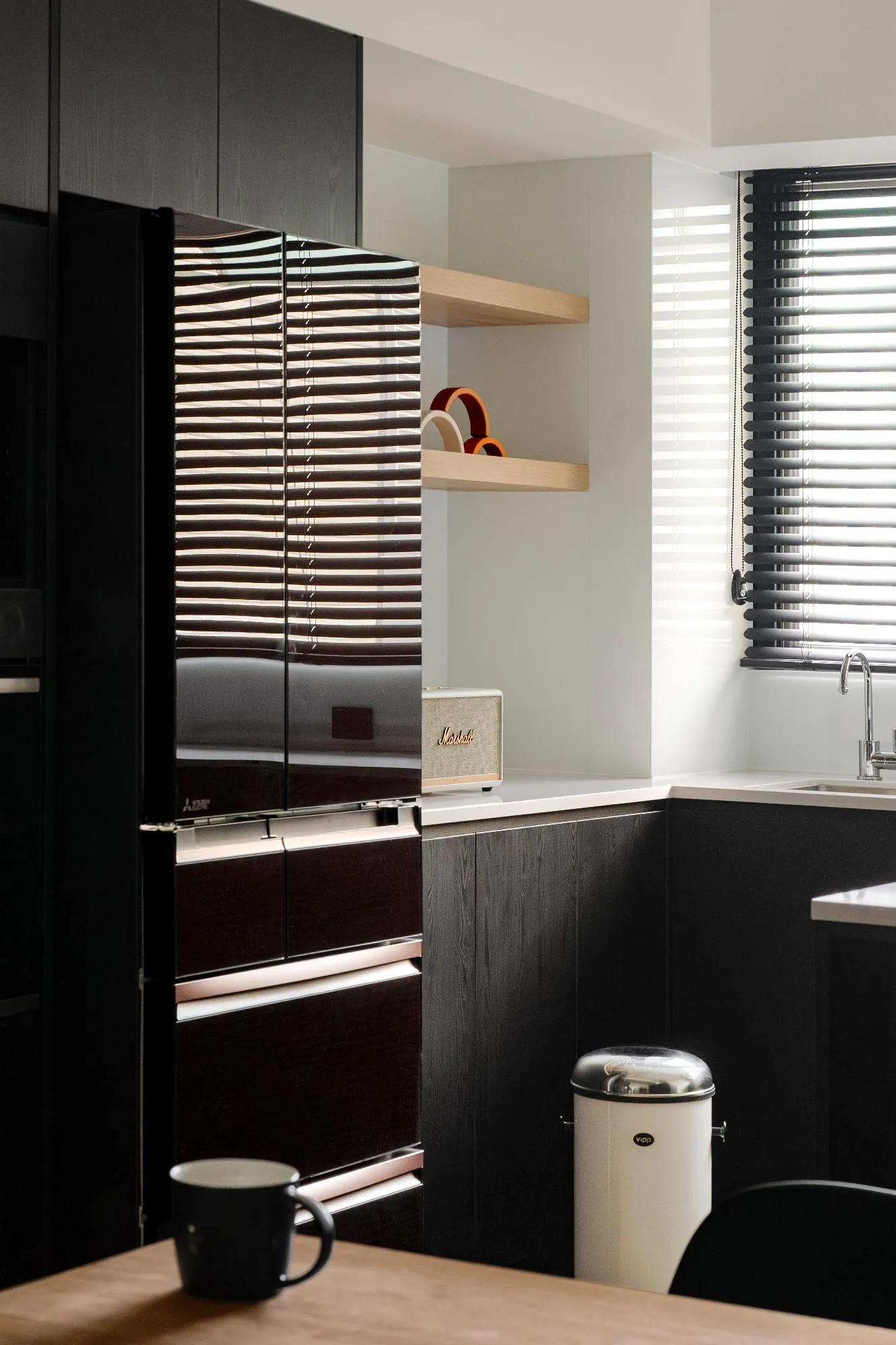 整體色調以黑白為基調,深色櫃體與淺色牆面形成對比,增強視覺張力,同時藉由高光與霧面質感交錯運用,讓黑白設計不顯單調,營造出現代而沉穩的氛圍。客廳無沙發的設計,使空間更加靈活,可依需求設置閱讀角、互動區或展示區,讓空間使用更具彈性。