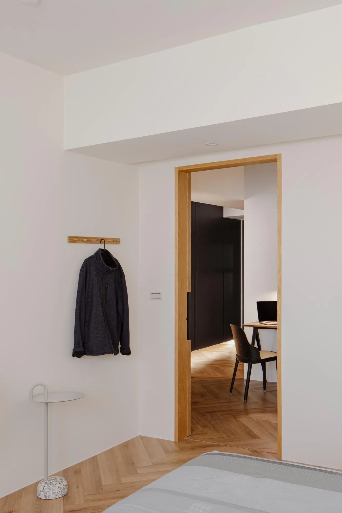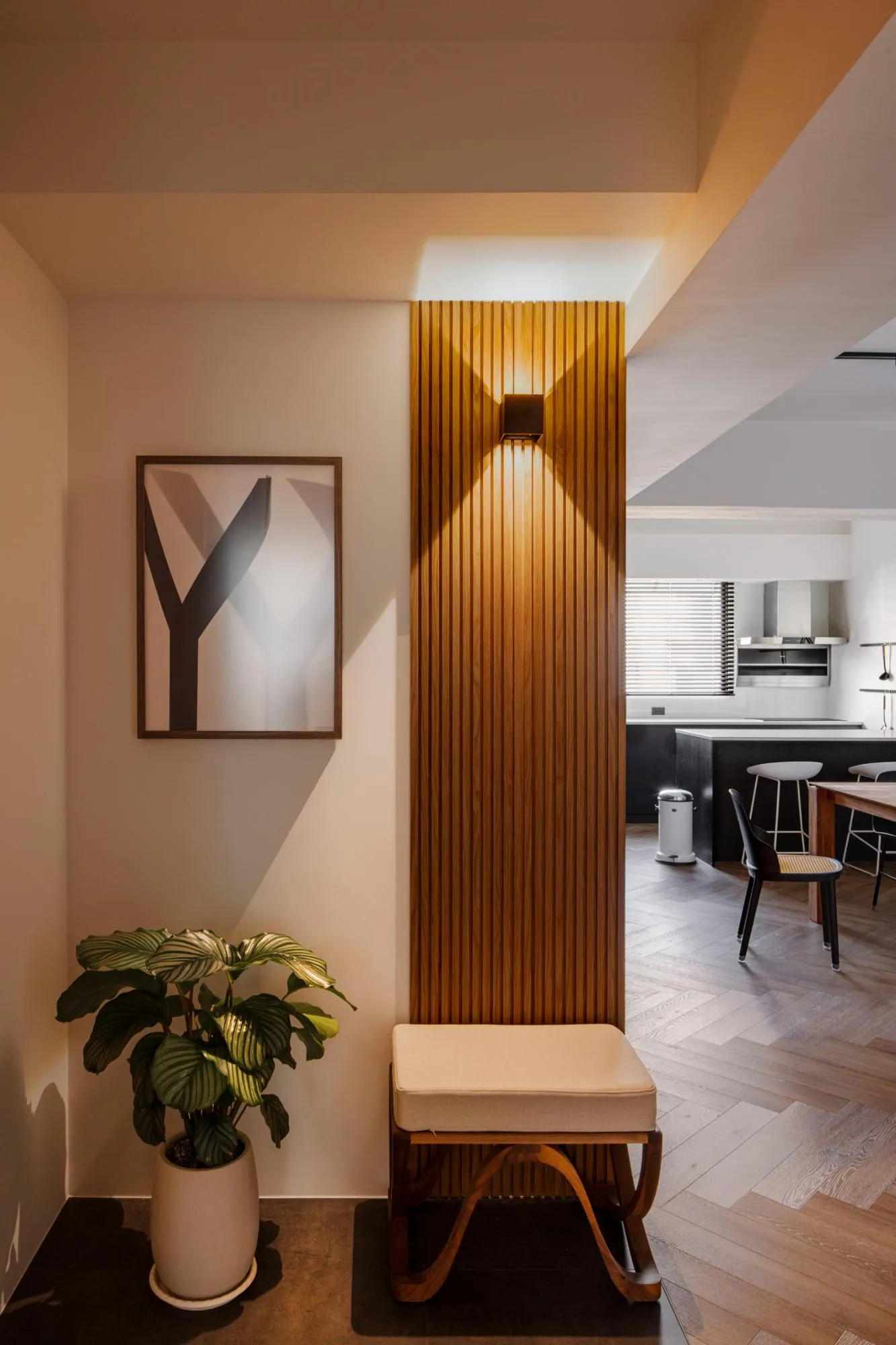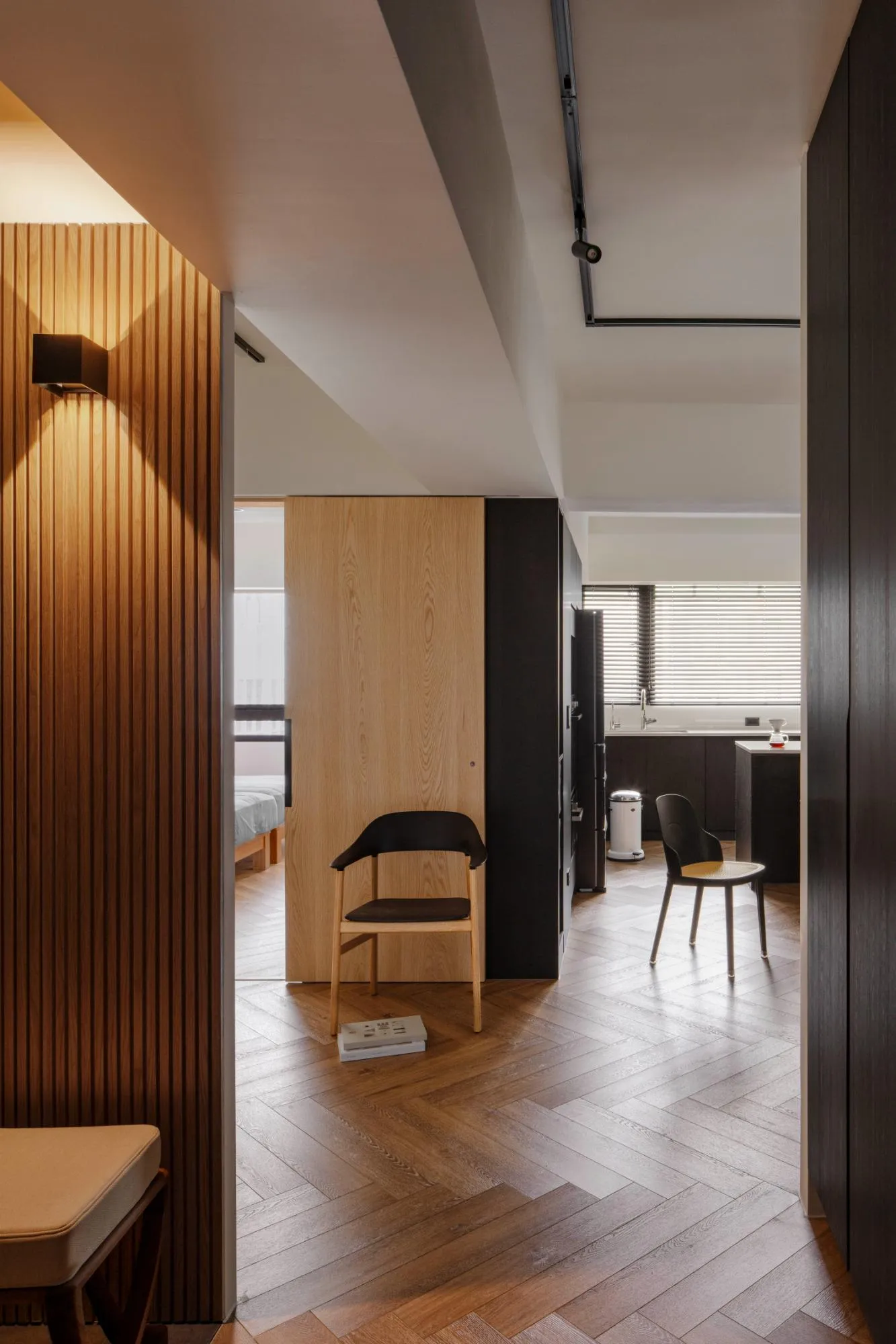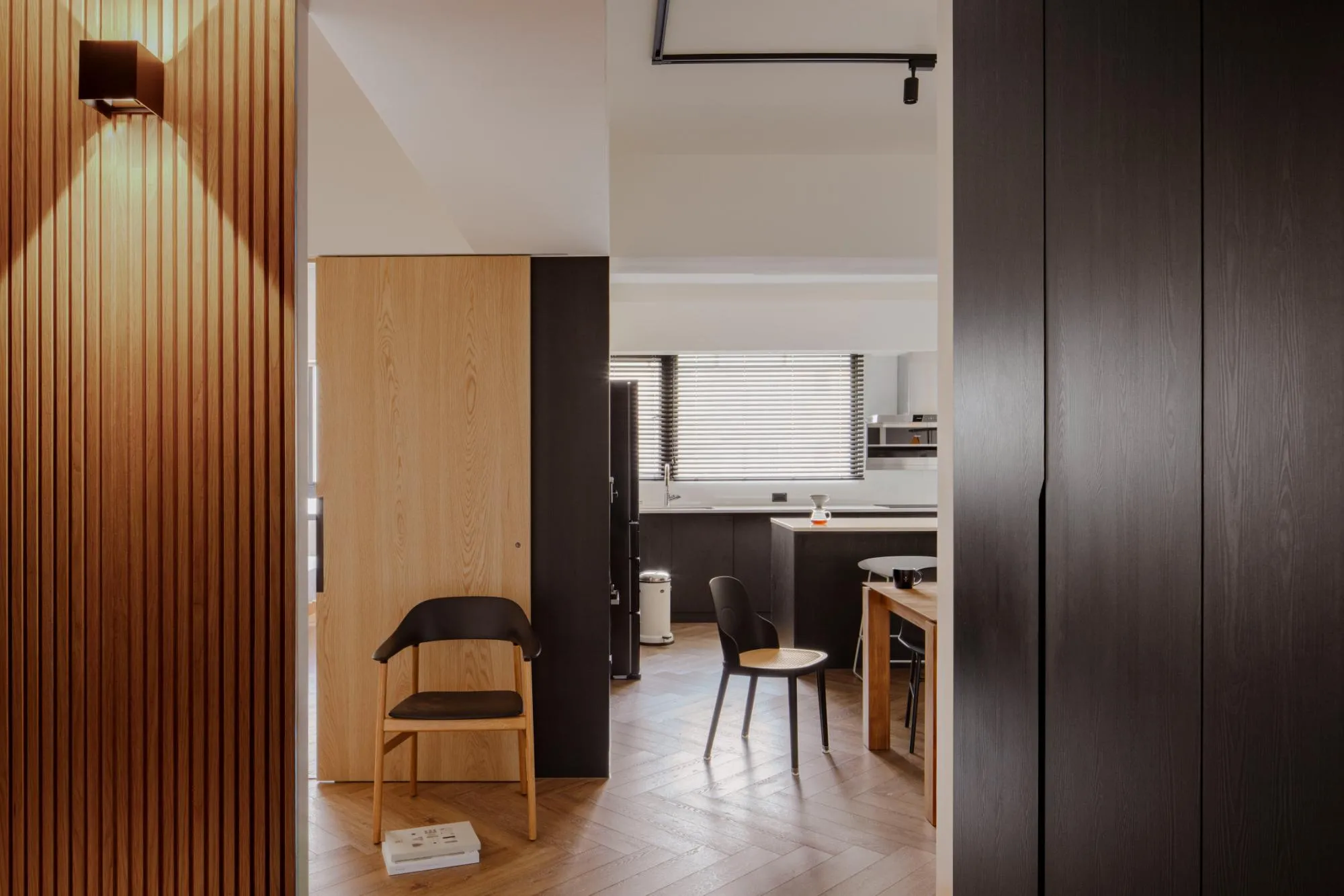 本設計透過方正格局的最大化運用,讓長桌成為家庭交流的核心,同時連結開放式廚房,使用餐、料理與休憩的動線更加流暢。無需繁複的裝修,而是藉由精選材質與光影變化,塑造簡潔且具有層次感的空間體驗。