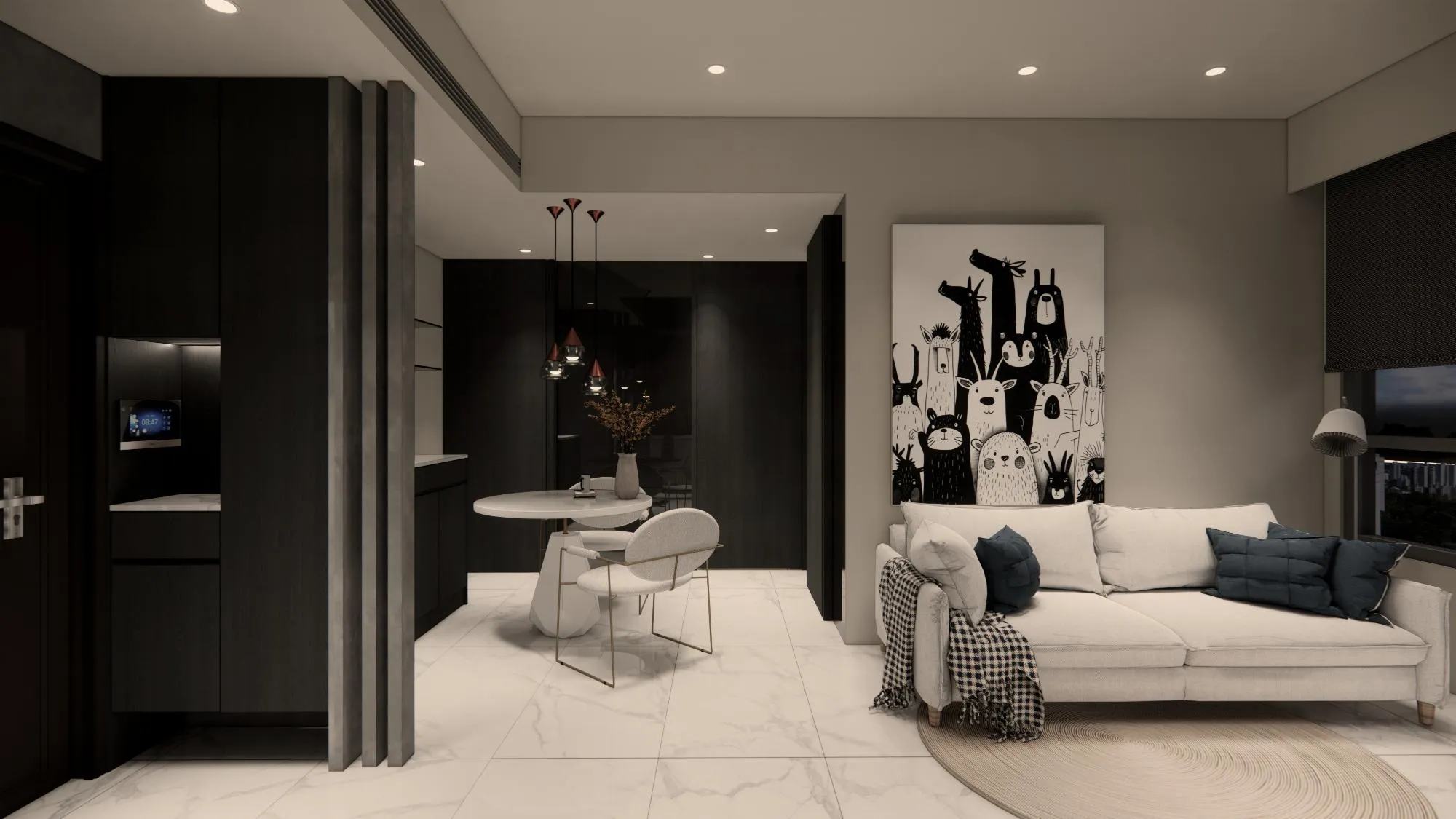以「黑與白=灰」為主軸,我們把空間當成一場黑與白的料理:白是留白與呼吸,黑是穩定與收束。