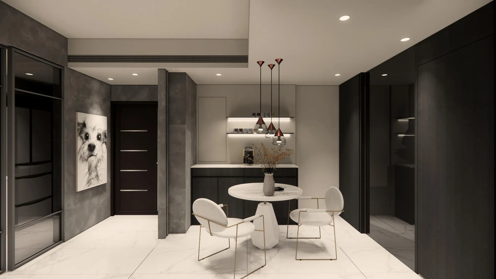 黑色鏡面延伸視覺景深,讓空間更開闊;質感黑色木皮紋理則像主菜的基底,沉穩、有力量。